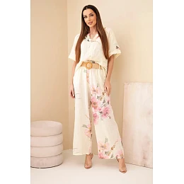 Top má klasický, mírně volný střih s krátkým rukávem a dekorativní zapínání na knoflík u výstřihu, což mu dodává jemnou eleganci. Kalhoty jsou vybaveny elastickým pasem, díky kterému se ideálně přizpůsobí postavě a zajišťují pohodlí po celý den. Dalším plusem je pásek, který krásně zvýrazní pas a dodá outfitu výjimečný charakter.