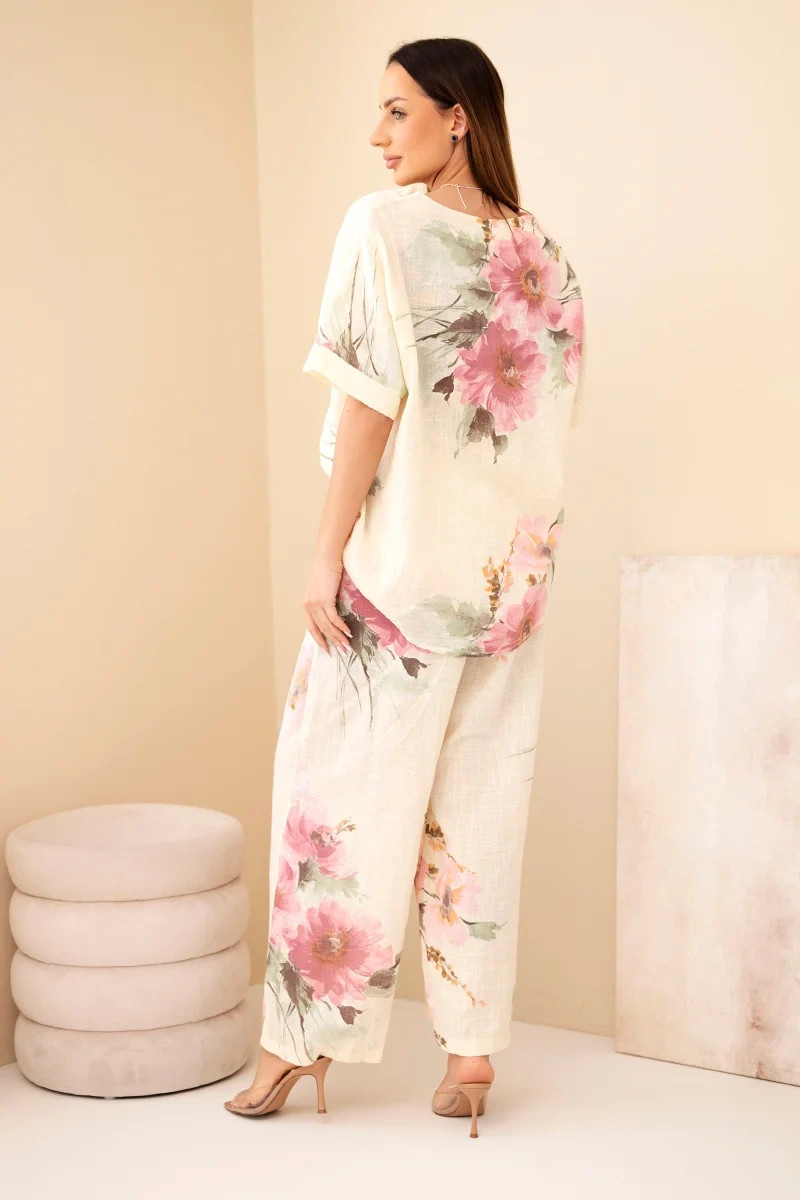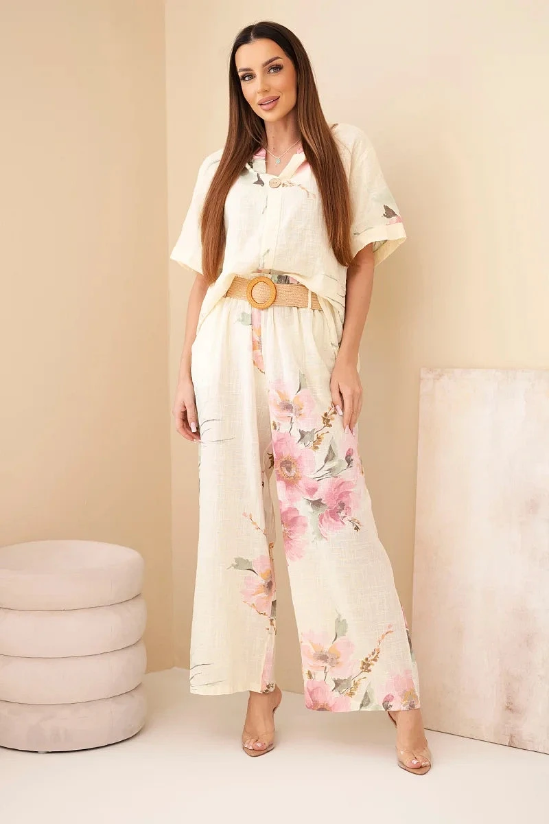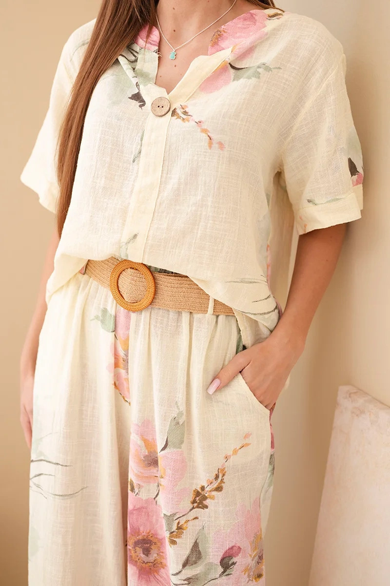Top má klasický, mírně volný střih s krátkým rukávem a dekorativní zapínání na knoflík u výstřihu, což mu dodává jemnou eleganci. Kalhoty jsou vybaveny elastickým pasem, díky kterému se ideálně přizpůsobí postavě a zajišťují pohodlí po celý den. Dalším plusem je pásek, který krásně zvýrazní pas a dodá outfitu výjimečný charakter.