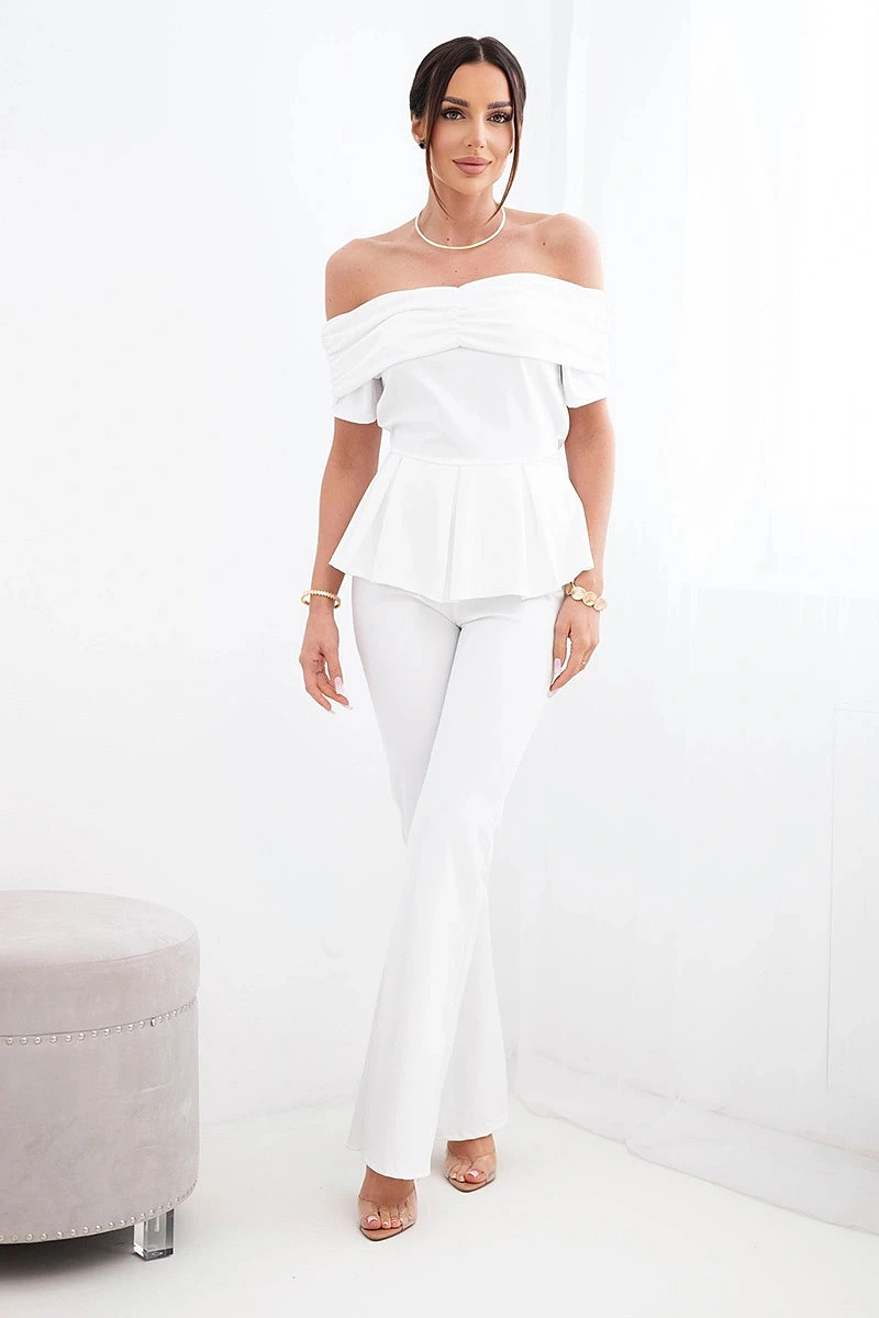 Elegantní dámský komplet je ideální volbou pro ženy, které chtějí vypadat stylově a žensky. Sada se skládá z efektní halenky typu Carmen a dlouhých kalhot se širokými nohavicemi, čímž vytváří módní a sladěný outfit. Halenka má krásný spadlý výstřih s volánem, který jemně odhaluje ramena a dodává romantický nádech. Přiléhavý střih s mírně rozšířeným spodkem zvýrazňuje pas a dodává lehkost.