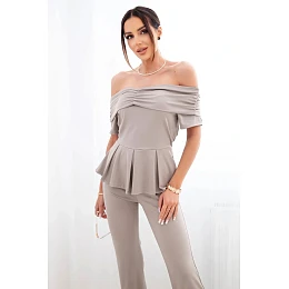 Elegantní dámský komplet je ideální volbou pro ženy, které chtějí vypadat stylově a žensky. Sada se skládá z efektní halenky typu Carmen a dlouhých kalhot se širokými nohavicemi, čímž vytváří módní a sladěný outfit. Halenka má krásný spadlý výstřih s volánem, který jemně odhaluje ramena a dodává romantický nádech. Přiléhavý střih s mírně rozšířeným spodkem zvýrazňuje pas a dodává lehkost.