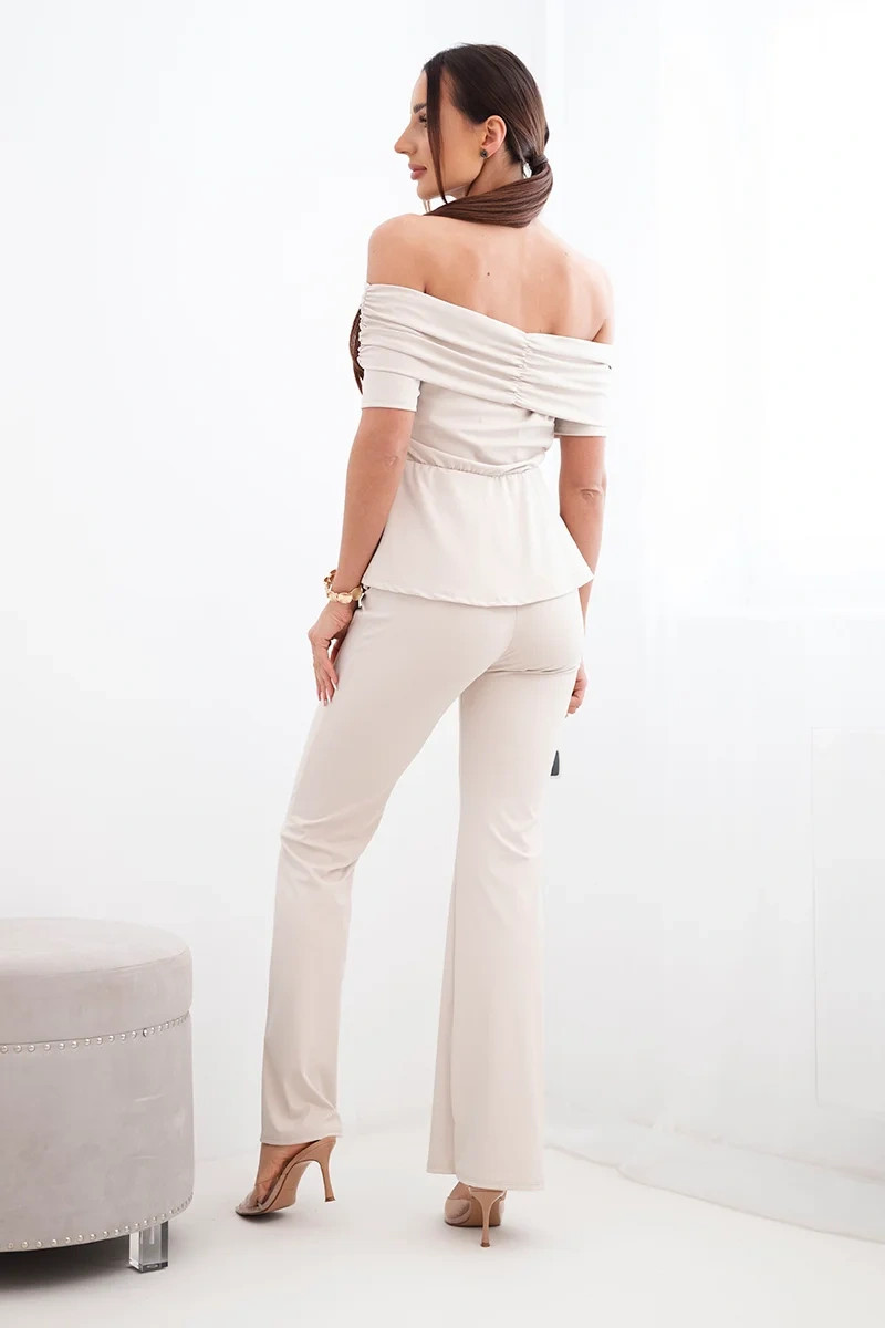 Elegantní dámský komplet je ideální volbou pro ženy, které chtějí vypadat stylově a žensky. Sada se skládá z efektní halenky typu Carmen a dlouhých kalhot se širokými nohavicemi, čímž vytváří módní a sladěný outfit. Halenka má krásný spadlý výstřih s volánem, který jemně odhaluje ramena a dodává romantický nádech. Přiléhavý střih s mírně rozšířeným spodkem zvýrazňuje pas a dodává lehkost.