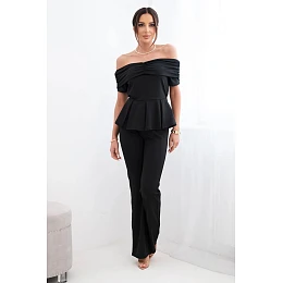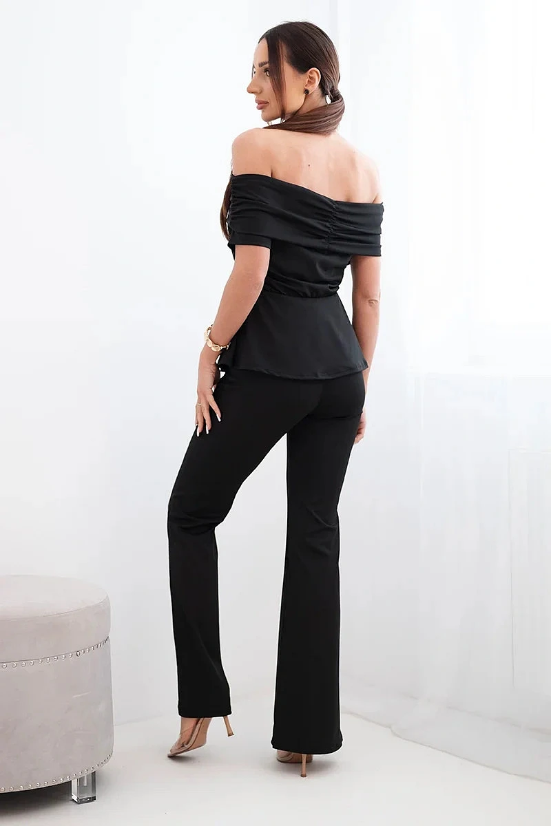 Elegantní dámský komplet je ideální volbou pro ženy, které chtějí vypadat stylově a žensky. Sada se skládá z efektní halenky typu Carmen a dlouhých kalhot se širokými nohavicemi, čímž vytváří módní a sladěný outfit. Halenka má krásný spadlý výstřih s volánem, který jemně odhaluje ramena a dodává romantický nádech. Přiléhavý střih s mírně rozšířeným spodkem zvýrazňuje pas a dodává lehkost.