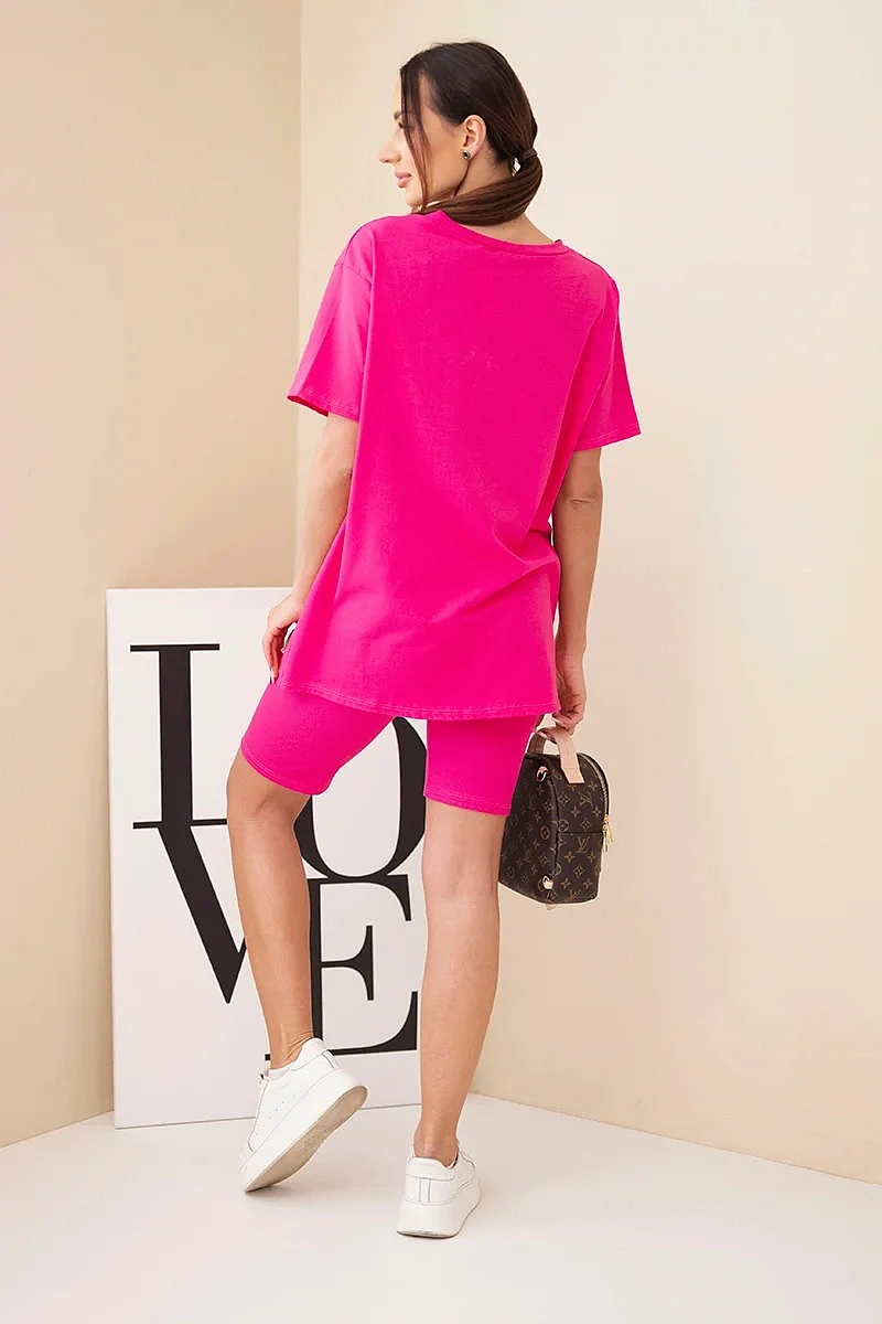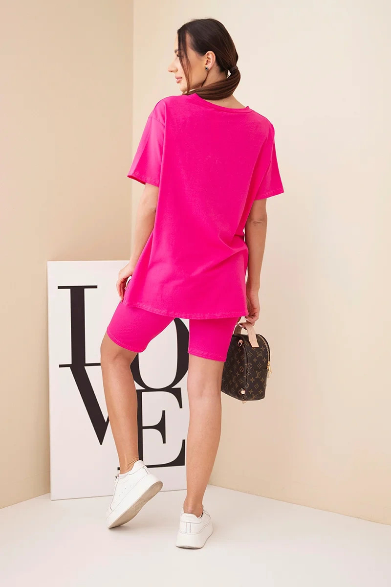 Pohodlný a stylový dámský komplet je ideální volbou pro ženy, které si cení komfortu a módního vzhledu pro každodenní nošení. Sada se skládá z klasického trička s krátkým rukávem a přiléhavých kraťasů, které společně tvoří soudržný a praktický outfit. Minimalistický střih činí komplet velmi univerzálním a snadno kombinovatelným – skvěle poslouží doma, na procházce i během letních dovolených.
