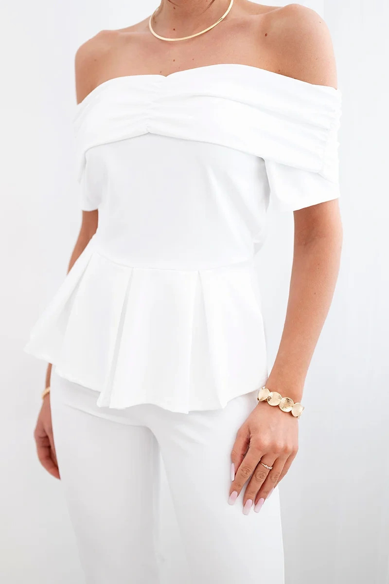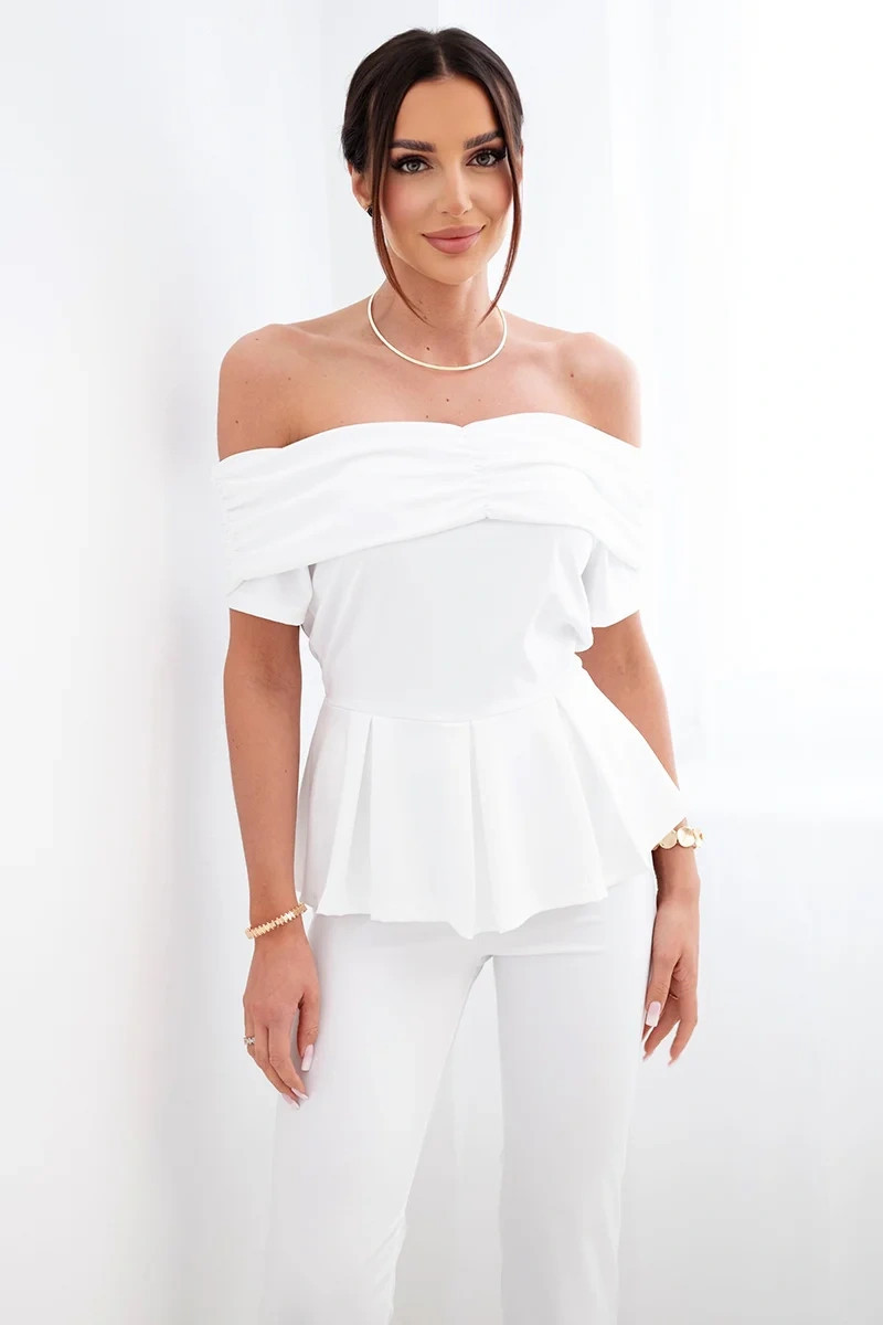 Elegantní dámský komplet je ideální volbou pro ženy, které chtějí vypadat stylově a žensky. Sada se skládá z efektní halenky typu Carmen a dlouhých kalhot se širokými nohavicemi, čímž vytváří módní a sladěný outfit. Halenka má krásný spadlý výstřih s volánem, který jemně odhaluje ramena a dodává romantický nádech. Přiléhavý střih s mírně rozšířeným spodkem zvýrazňuje pas a dodává lehkost.