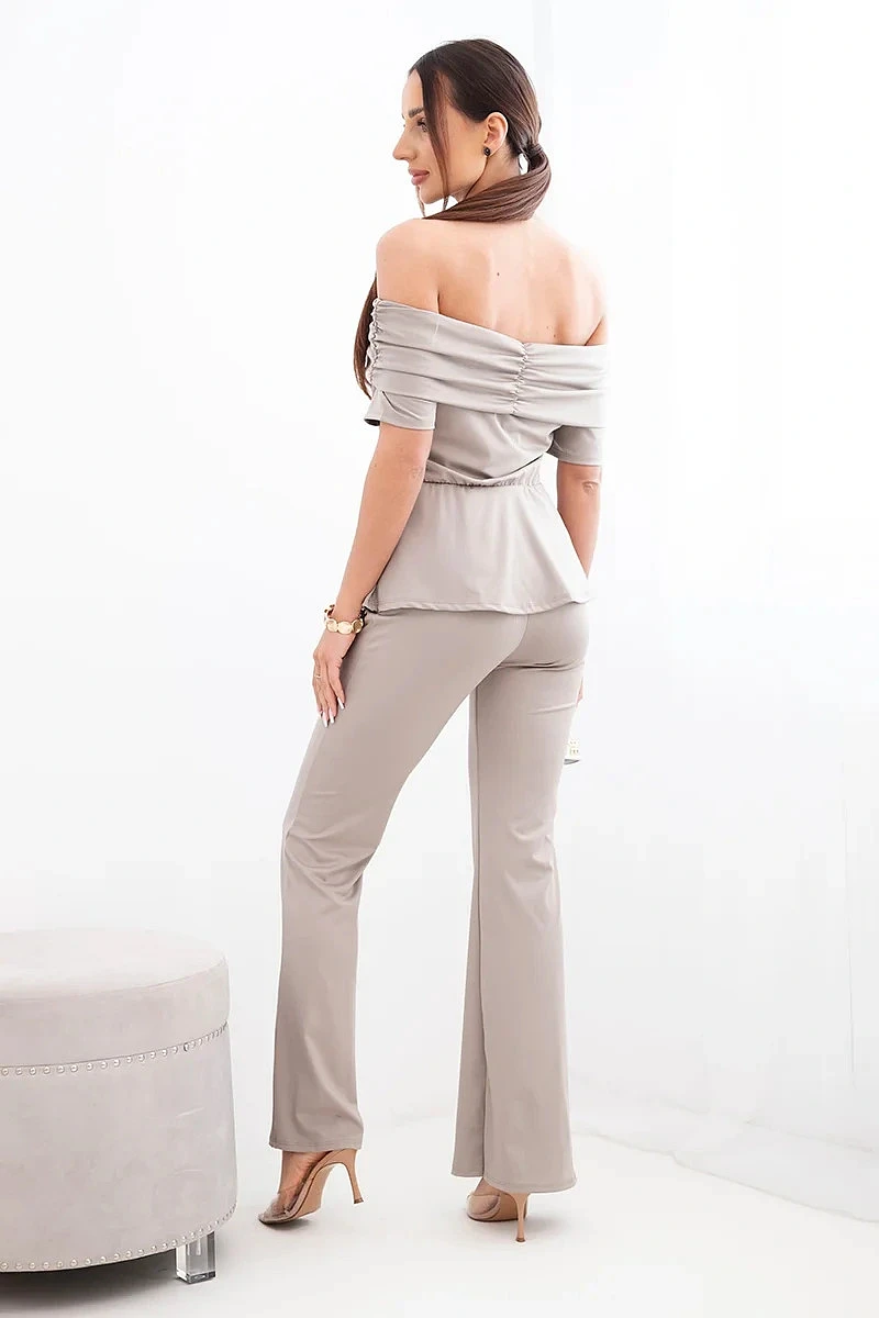 Elegantní dámský komplet je ideální volbou pro ženy, které chtějí vypadat stylově a žensky. Sada se skládá z efektní halenky typu Carmen a dlouhých kalhot se širokými nohavicemi, čímž vytváří módní a sladěný outfit. Halenka má krásný spadlý výstřih s volánem, který jemně odhaluje ramena a dodává romantický nádech. Přiléhavý střih s mírně rozšířeným spodkem zvýrazňuje pas a dodává lehkost.