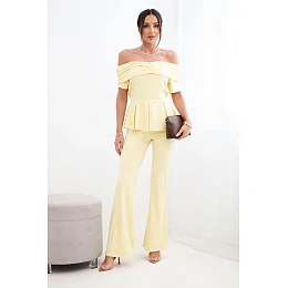 Elegantní dámský komplet je ideální volbou pro ženy, které chtějí vypadat stylově a žensky. Sada se skládá z efektní halenky typu Carmen a dlouhých kalhot se širokými nohavicemi, čímž vytváří módní a sladěný outfit. Halenka má krásný spadlý výstřih s volánem, který jemně odhaluje ramena a dodává romantický nádech. Přiléhavý střih s mírně rozšířeným spodkem zvýrazňuje pas a dodává lehkost.