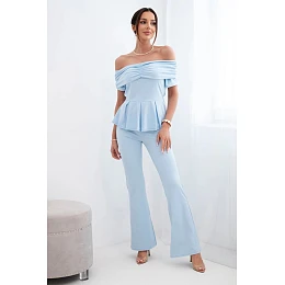 Elegantní dámský komplet je ideální volbou pro ženy, které chtějí vypadat stylově a žensky. Sada se skládá z efektní halenky typu Carmen a dlouhých kalhot se širokými nohavicemi, čímž vytváří módní a sladěný outfit. Halenka má krásný spadlý výstřih s volánem, který jemně odhaluje ramena a dodává romantický nádech. Přiléhavý střih s mírně rozšířeným spodkem zvýrazňuje pas a dodává lehkost.