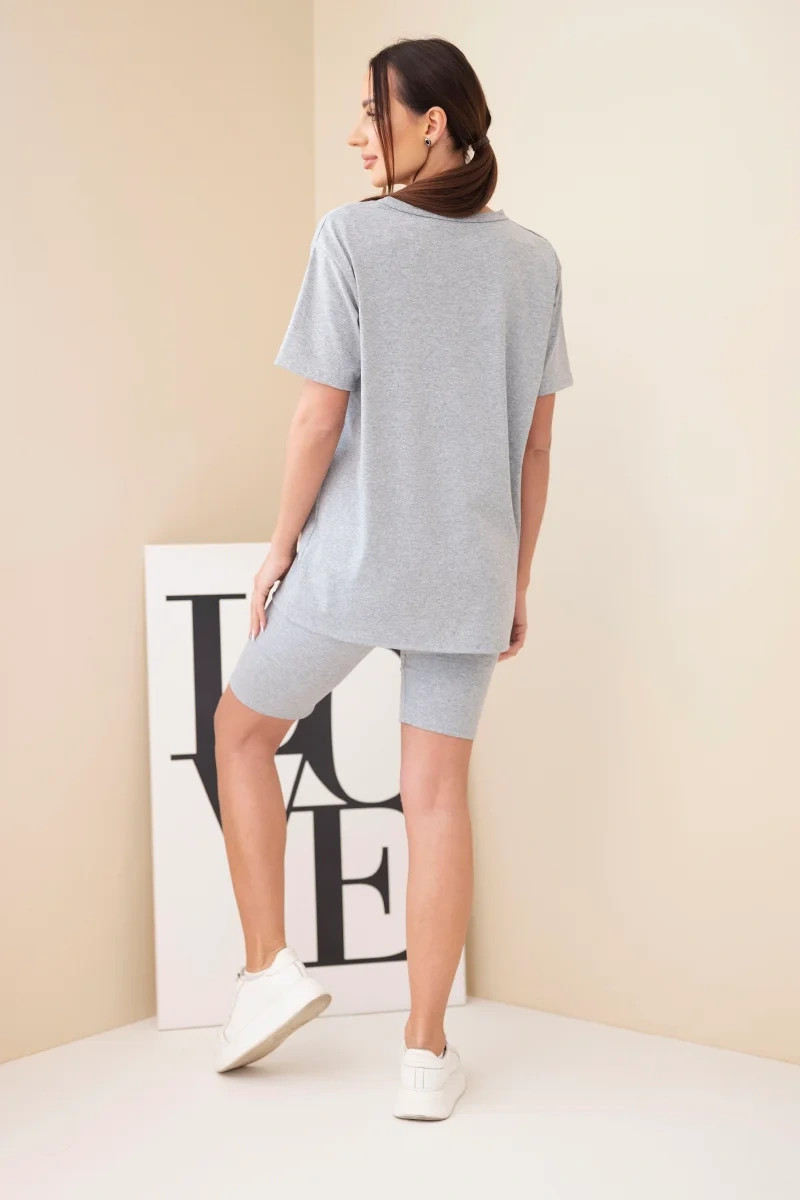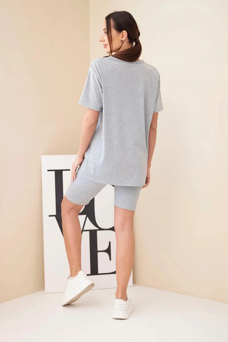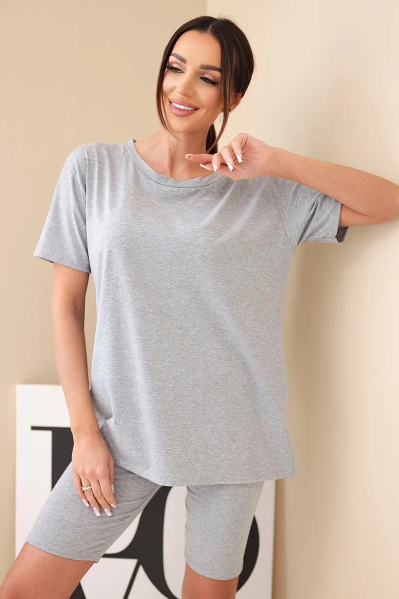 Pohodlný a stylový dámský komplet je ideální volbou pro ženy, které si cení komfortu a módního vzhledu pro každodenní nošení. Sada se skládá z klasického trička s krátkým rukávem a přiléhavých kraťasů, které společně tvoří soudržný a praktický outfit. Minimalistický střih činí komplet velmi univerzálním a snadno kombinovatelným – skvěle poslouží doma, na procházce i během letních dovolených.