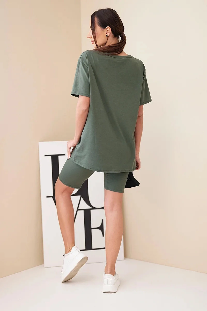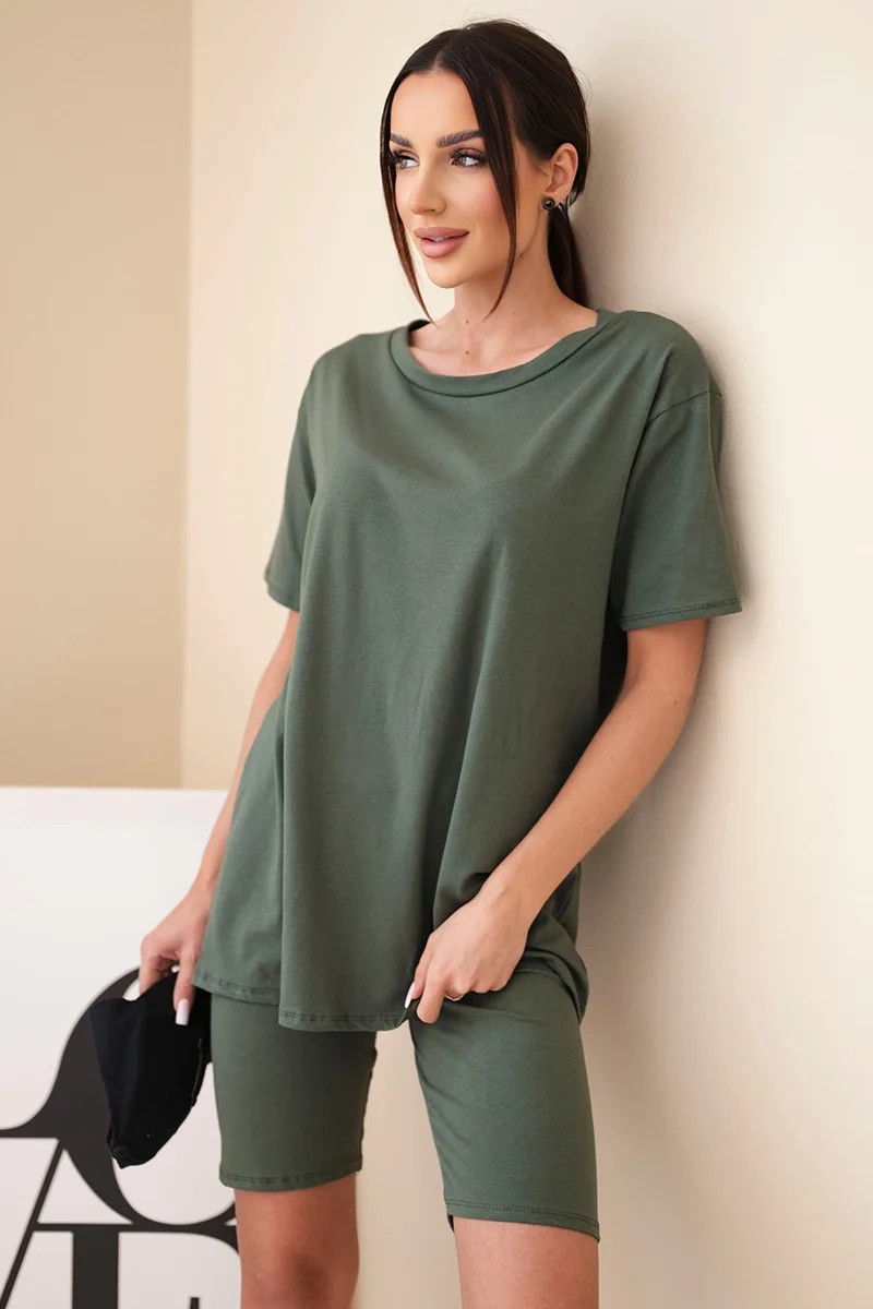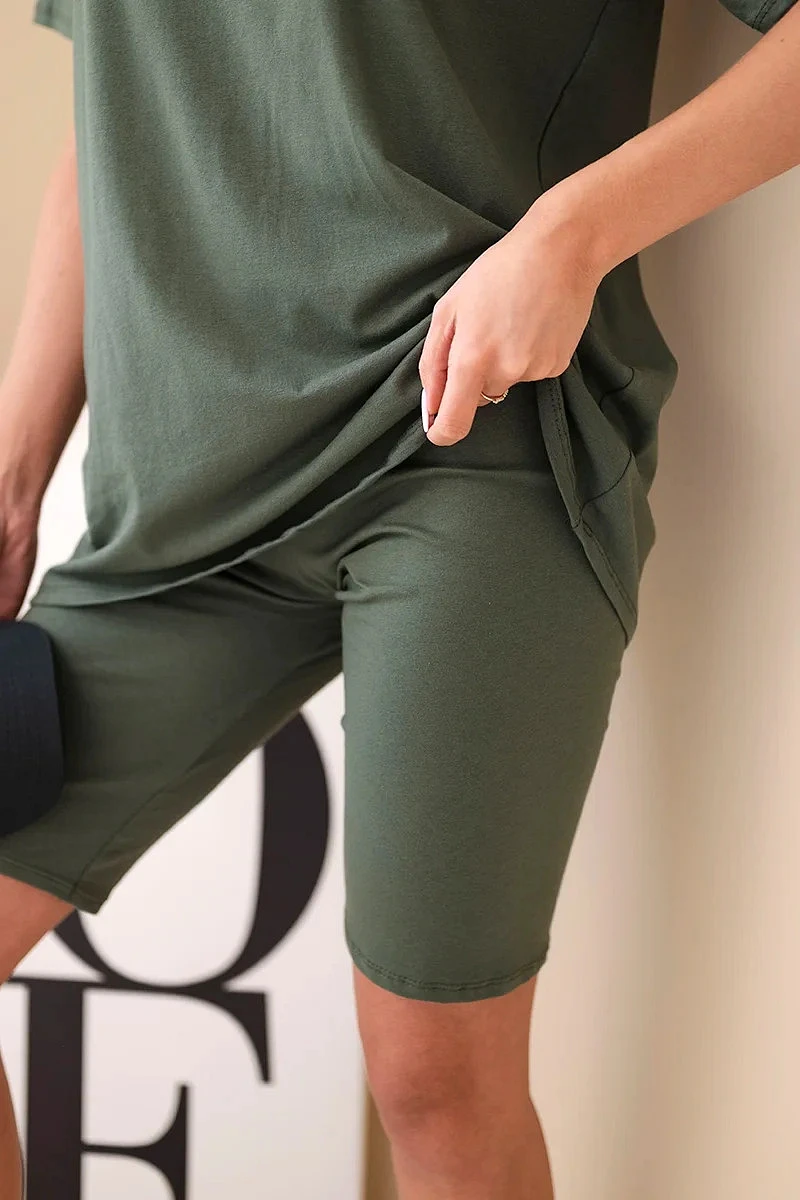 Pohodlný a stylový dámský komplet je ideální volbou pro ženy, které si cení komfortu a módního vzhledu pro každodenní nošení. Sada se skládá z klasického trička s krátkým rukávem a přiléhavých kraťasů, které společně tvoří soudržný a praktický outfit. Minimalistický střih činí komplet velmi univerzálním a snadno kombinovatelným – skvěle poslouží doma, na procházce i během letních dovolených.