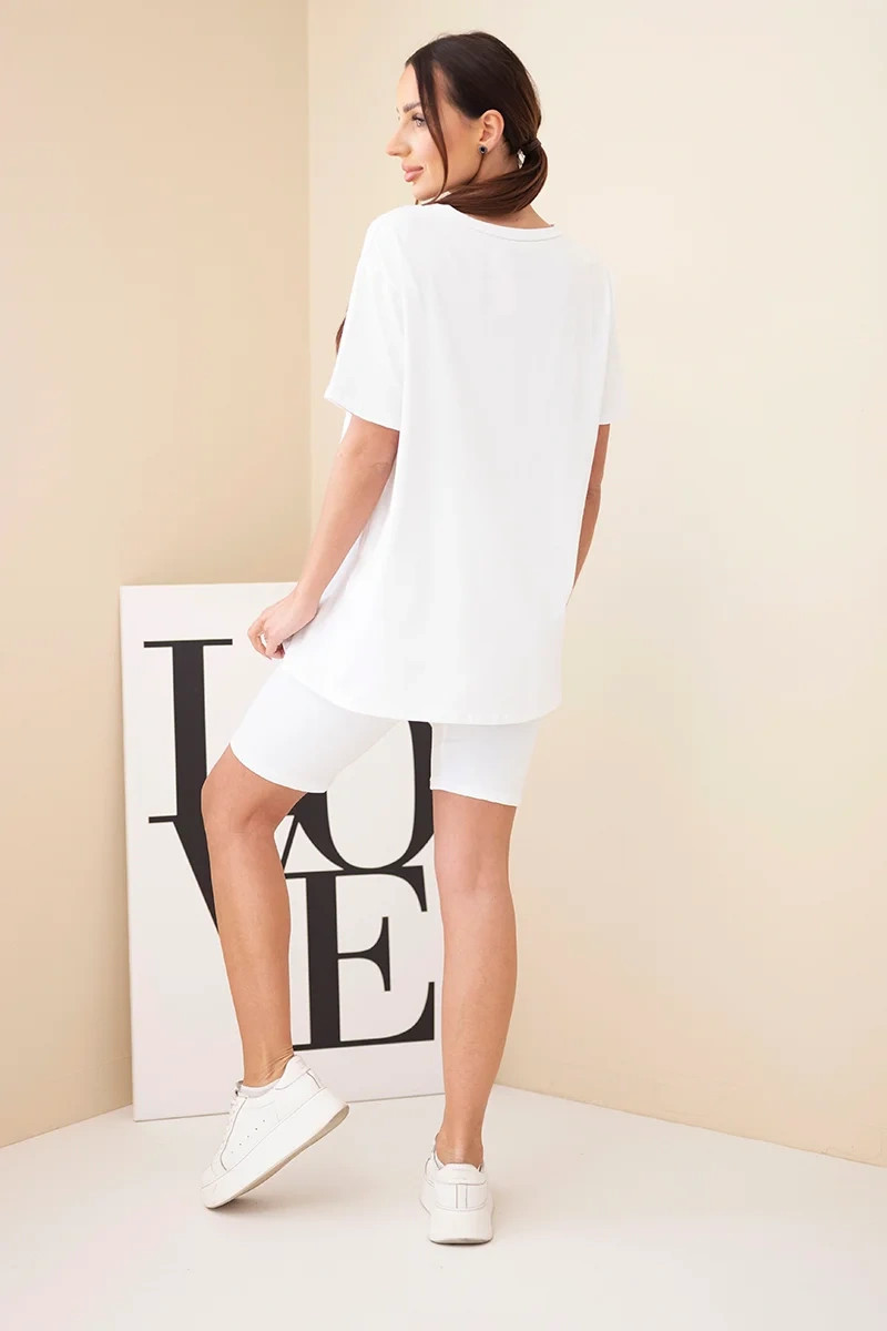 Pohodlný a stylový dámský komplet je ideální volbou pro ženy, které si cení komfortu a módního vzhledu pro každodenní nošení. Sada se skládá z klasického trička s krátkým rukávem a přiléhavých kraťasů, které společně tvoří soudržný a praktický outfit. Minimalistický střih činí komplet velmi univerzálním a snadno kombinovatelným – skvěle poslouží doma, na procházce i během letních dovolených.