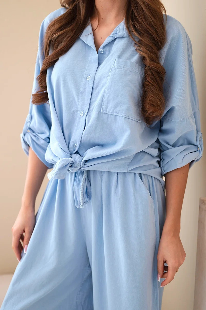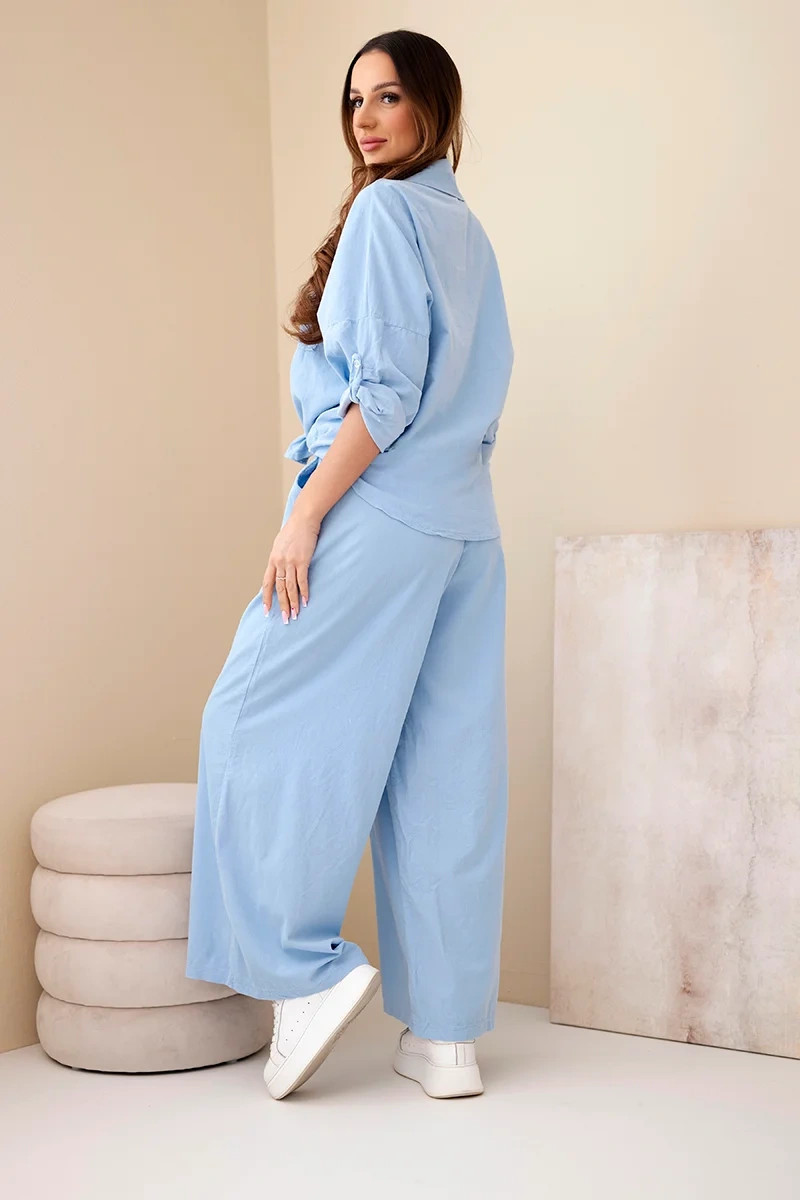 Dámský bavlněný komplet s model 22015462 košilí a širokými nohavicemi modrý - K-Fashion