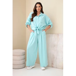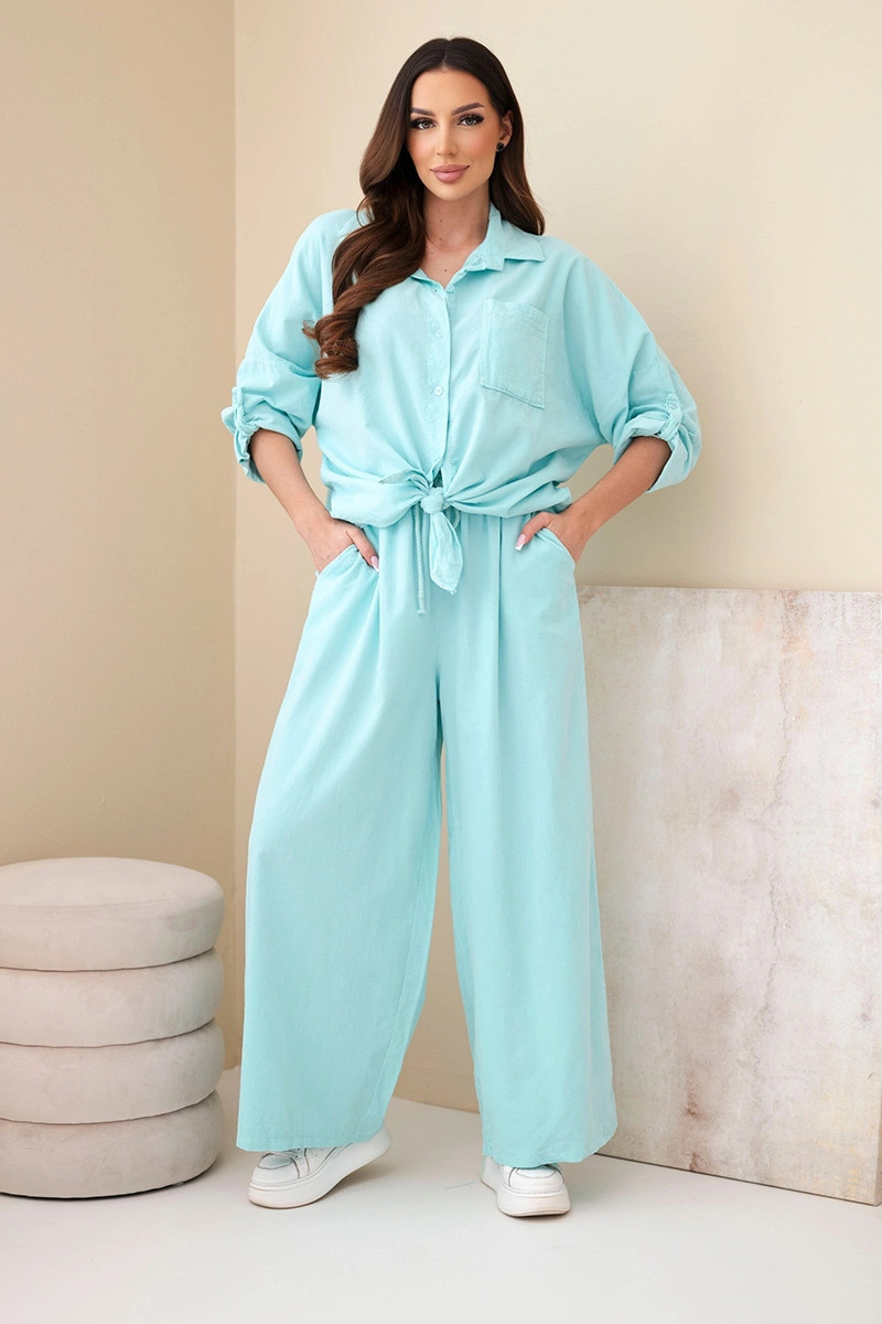 Dámský bavlněný komplet s uvázanou košilí a širokými nohavicemi mentolový