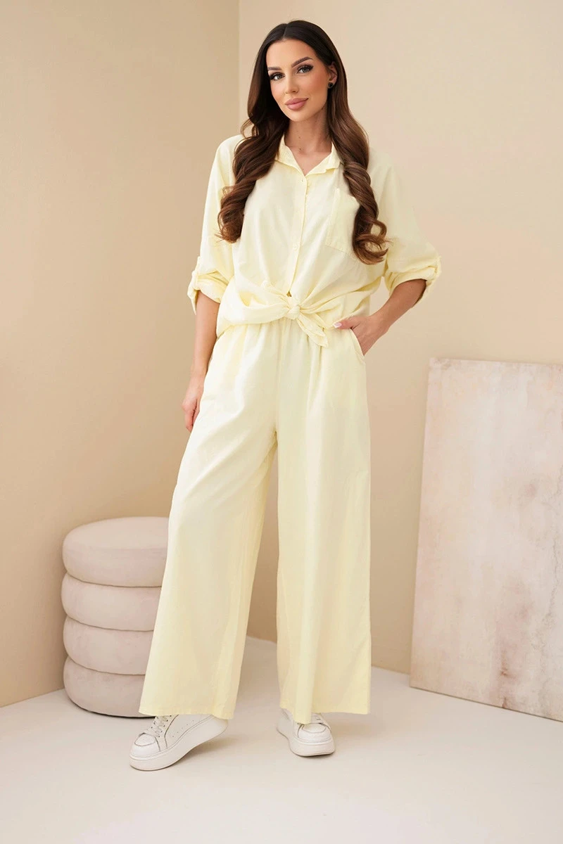 Dámský bavlněný komplet s vázanou košilí a širokými nohavicemi žlutý