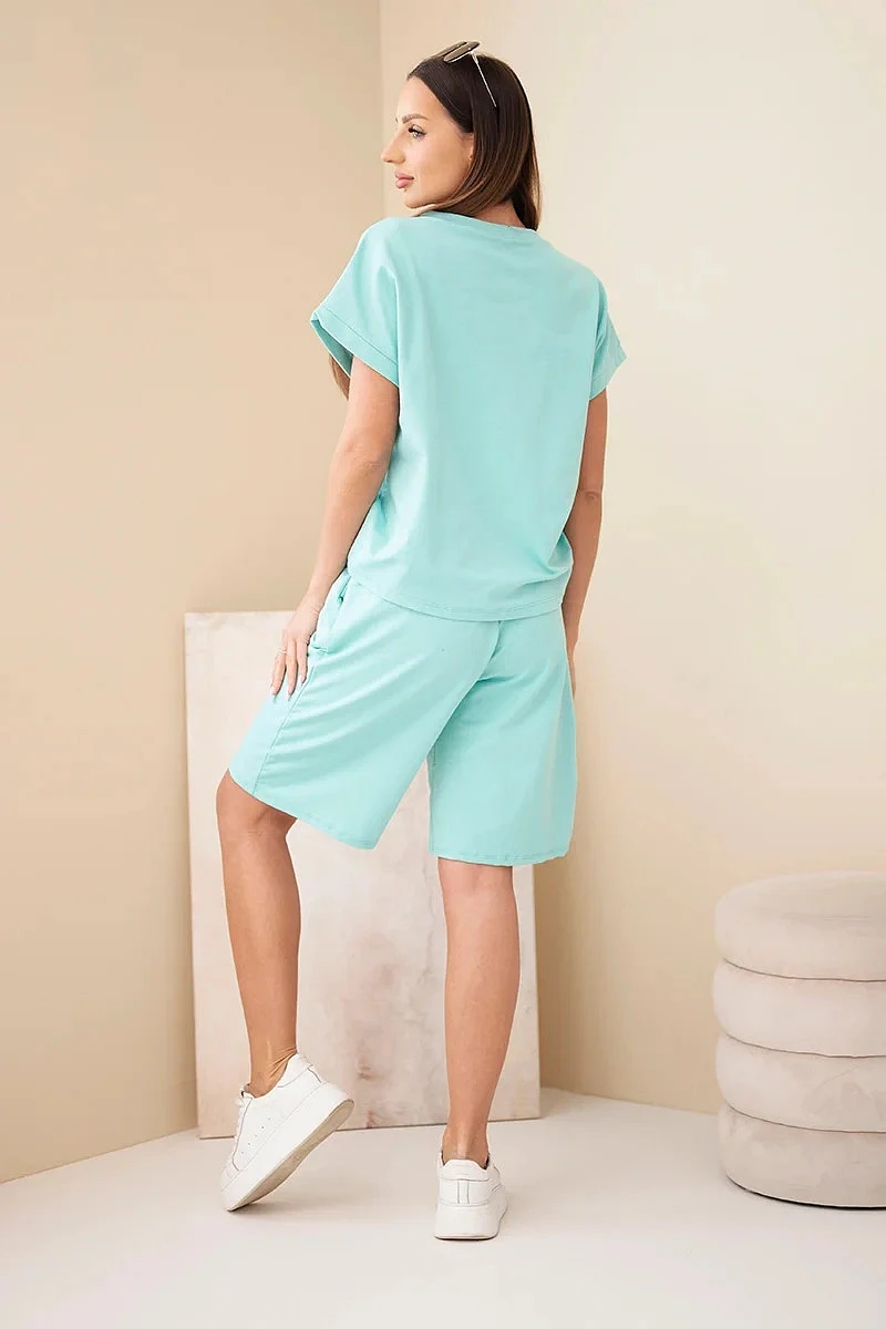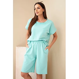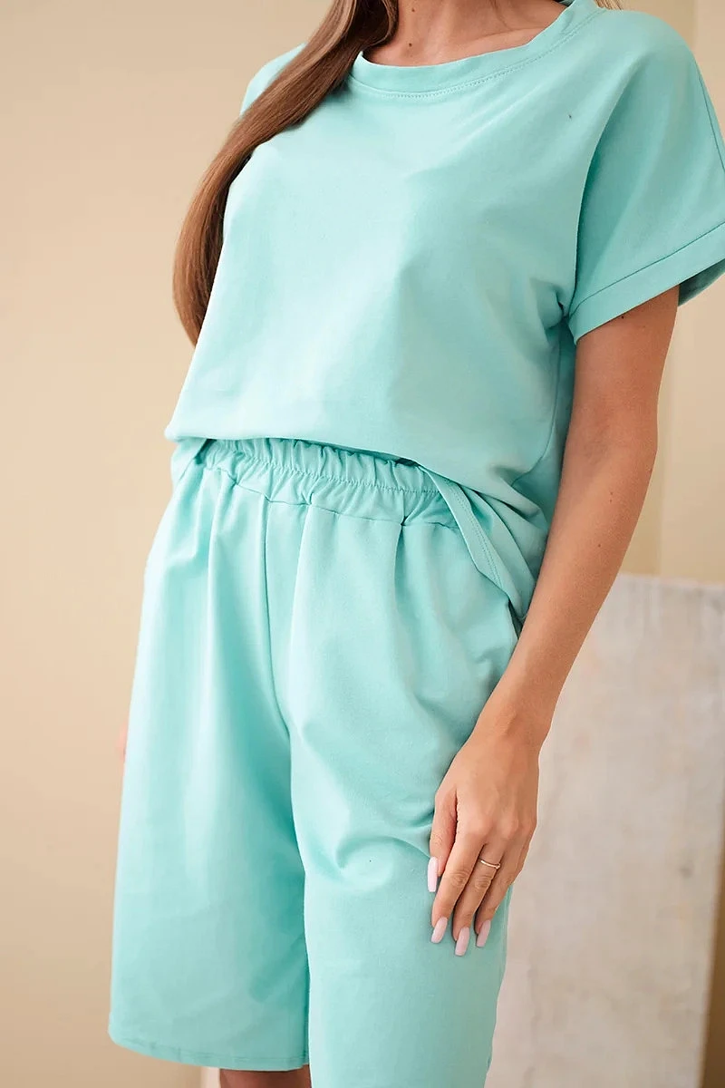 Dámský bavlněný komplet tričko s krátkým rukávem a kraťasy s gumou v pase mentolový