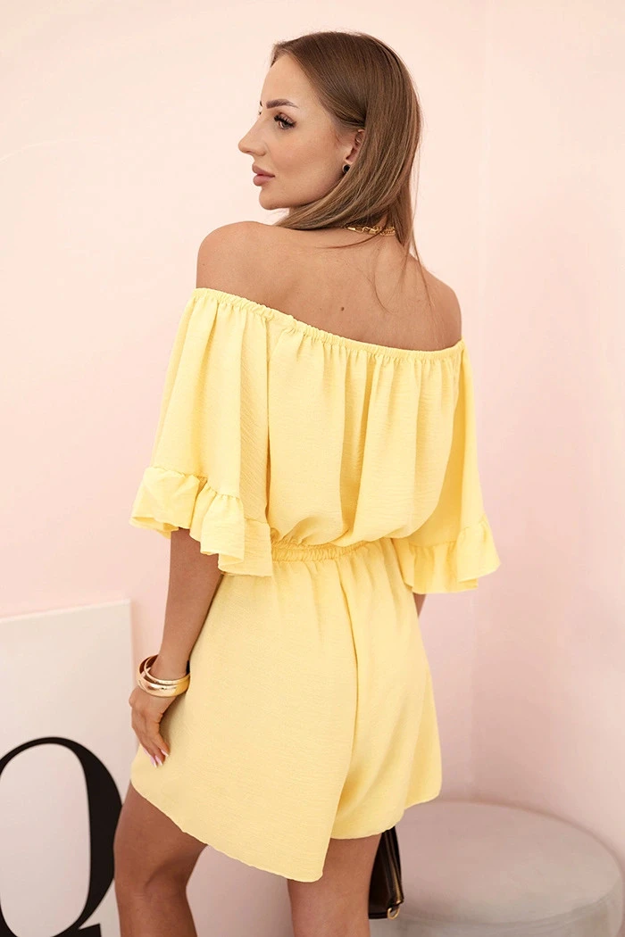 Tento dámský overal typu hiszpanka je efektní a ženský návrh ideální na letní dny. Odkryté ramena krásně zvýrazňují siluetu, a volánky na rukávech dodávají celku lehkost a módní charakter. Elastická guma v pase zajišťuje pohodlí při nošení a opticky zeštíhluje postavu.