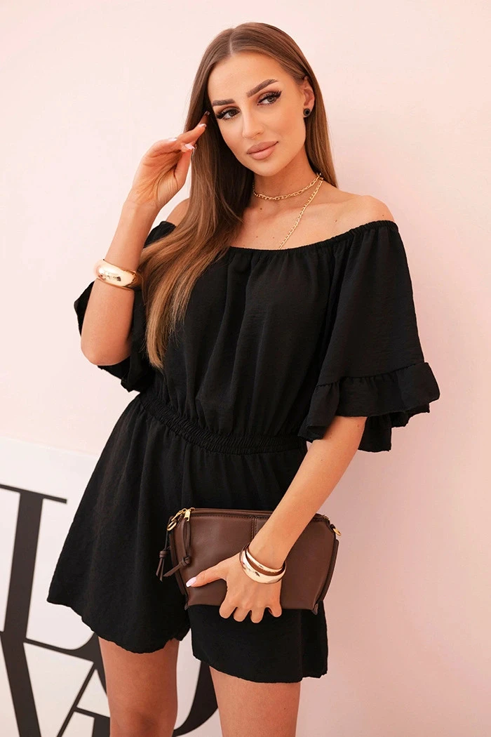 Tento dámský overal typu hiszpanka je efektní a ženský návrh ideální na letní dny. Odkryté ramena krásně zvýrazňují siluetu, a volánky na rukávech dodávají celku lehkost a módní charakter. Elastická guma v pase zajišťuje pohodlí při nošení a opticky zeštíhluje postavu.