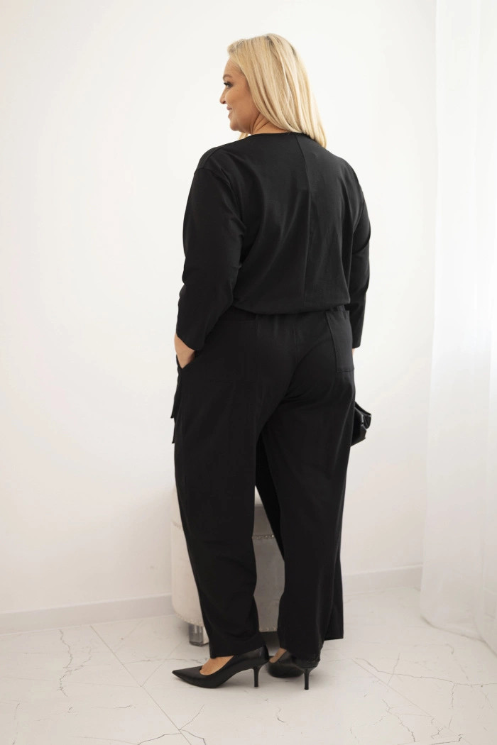 Dámský bavlněný overal Plus Size s vázáním v pase a 3/4 rukávem černý