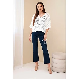 Dámský bavlněný prolamovaný svetr model 22122080 na knoflíky s krátkým rukávem bílý - K-Fashion