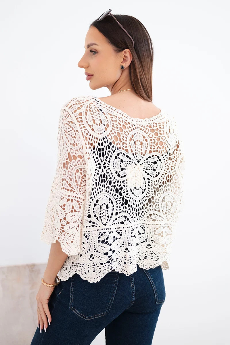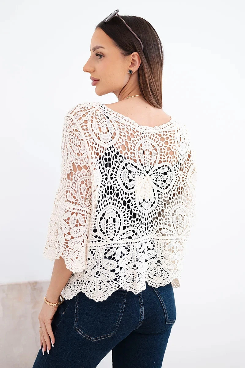 Dámský svetr má volnější střih a kratší délku, která se skvěle hodí k džínám s vysokým pasem, sukním nebo šortkám. Široké 3/4 rukávy dodávají celku lehkost a styl a odpovídají současným módním trendům. Ažurový materiál nejen upoutá pozornost, ale také zajišťuje správnou cirkulaci vzduchu.