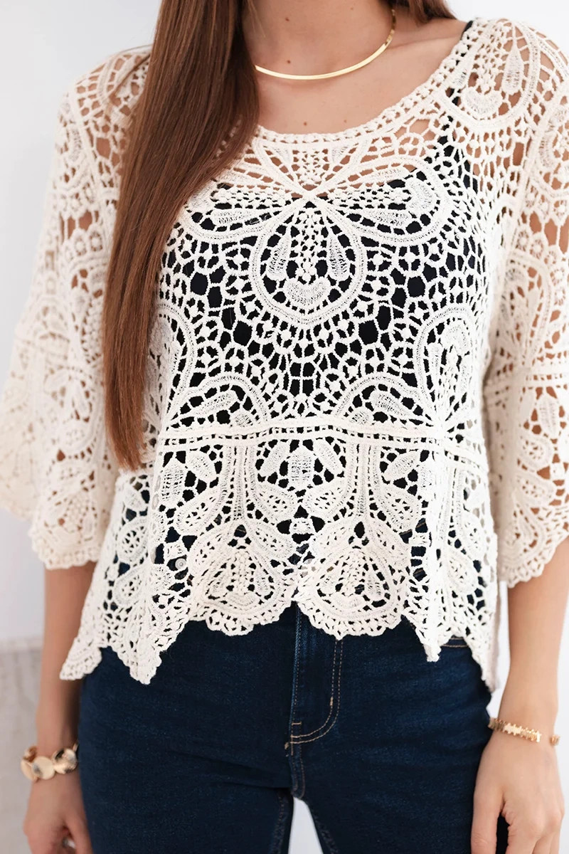 Dámský bavlněný prolamovaný svetr s krátkým rukávem a ozdobným vzorem béžový