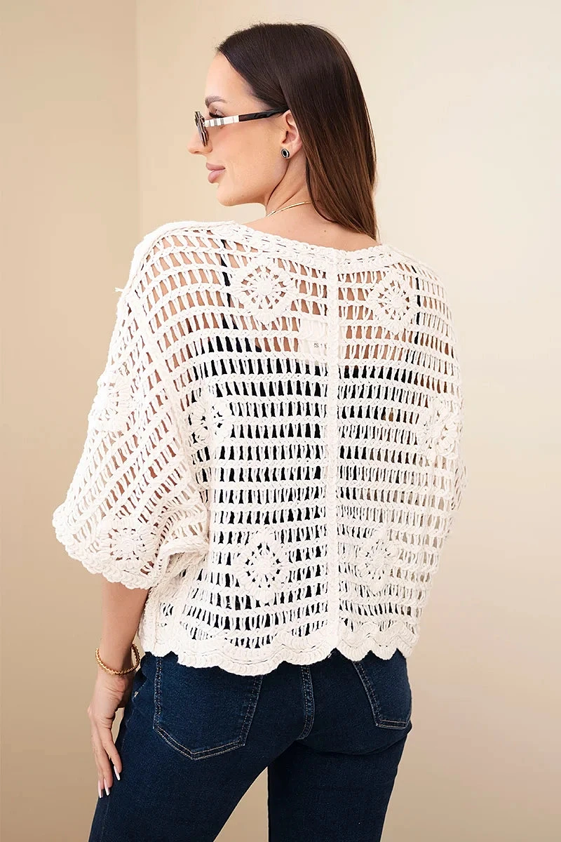 Lehký a stylový dámský svetr s ažurovým pletením je ideální volbou pro teplejší dny. Model vyniká výjimečným dekorativním vzorem, který mu dodává jemný a ženský charakter. Díky vzdušné struktuře materiálu svetr zajišťuje pohodlí i v teplejších dnech a zároveň vypadá velmi módně.