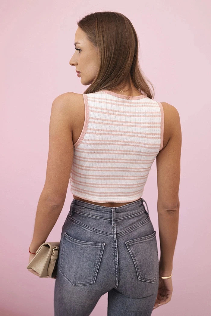 Stylový dámský top s proužky a efektním zlatým detailem na výstřihu je skvělou volbou na teplé dny. Krátký střih dokonale zvýrazňuje pas, a výstřih pod prsy a hluboký dekolt dodávají ženský charakter. Měkký, elastický materiál zajišťuje, že se top skvěle přizpůsobí postavě a poskytuje plné pohodlí při nošení.