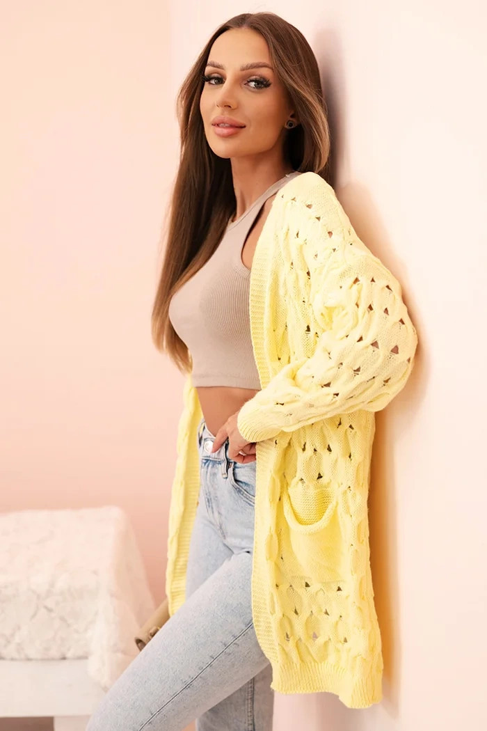 Tento dámský svetřík s krajkovým vzorem je vynikající volbou pro ženy, které si cení pohodlí, stylu a originálního vzhledu. Vyrobený z měkkého, příjemného materiálu, vyniká módním, krajkovým pletením, které mu dodává lehkost a ženské kouzlo. Delší střih skvěle ladí jak s legínami, tak s přiléhavými džíny. Svetřík má praktické kapsy vpředu, které mu dodávají funkčnost, a absence zapínání podtrhuje jeho uvolněný, casualový styl. Ideální na chladnější dny na jaře a v létě, také se osvědčí jako stylový doplněk do kanceláře nebo na procházku. Velikost je univerzální a bude vhodná pro dámy ve velikosti S, M nebo L.