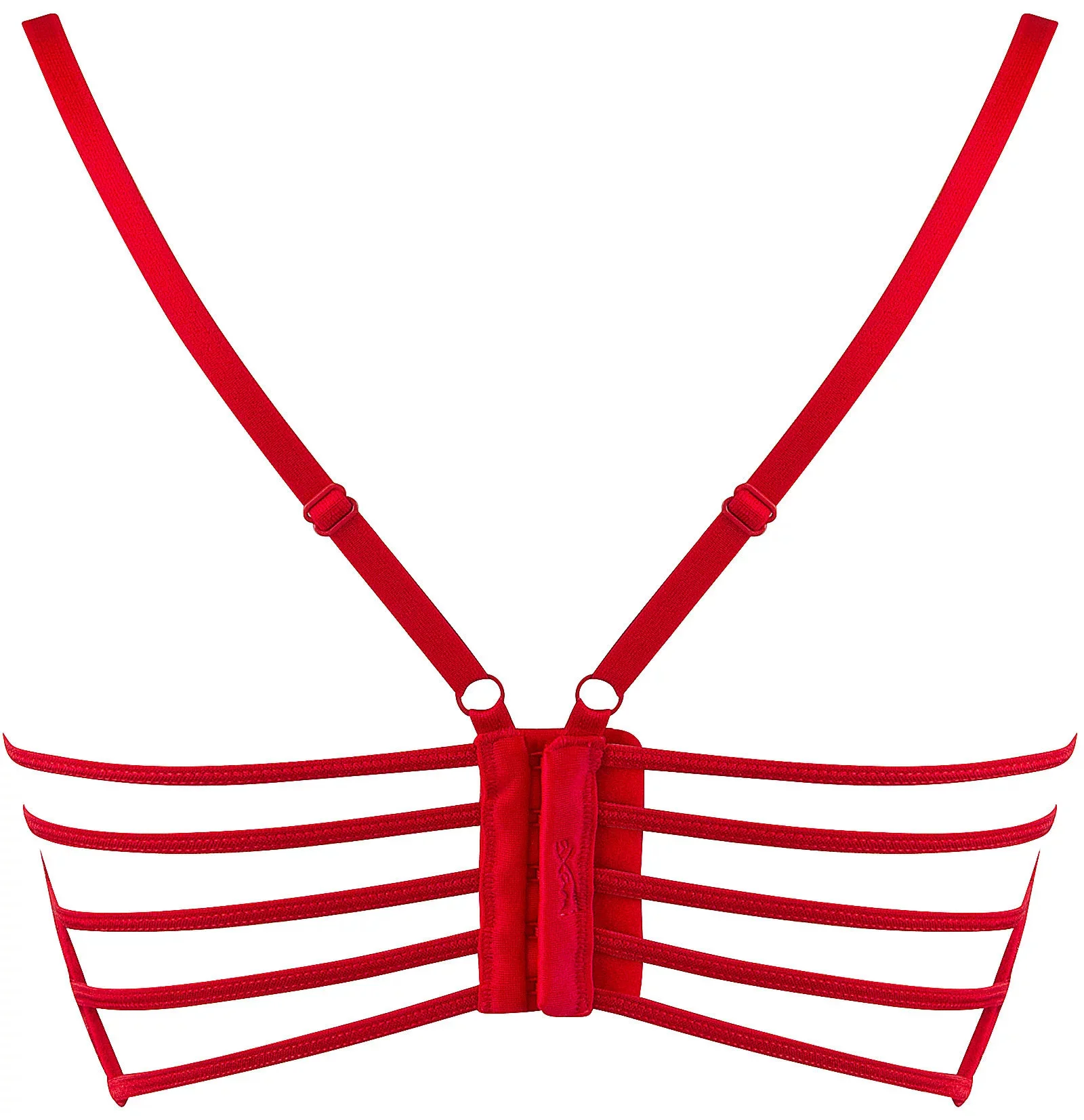 Měkký krajkový polokorzet v sytě plamenné červené barvě s ozdobnou květinovou výšivkou a volánkovými ozdobami obepíná poprsí a dodává mu výrazný a svůdný tvar. Záda tvoří síťovaná ramínka spojená jednou velkou sponou a spojená nastavitelnými ramínky ve tvaru písmene V. Neobyčejně sexy styl doplňují brazilská tanga v-9698 zdobená bohatou výšivkou v kombinaci s krajkou.