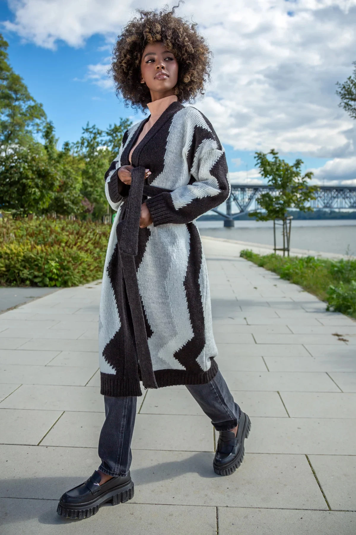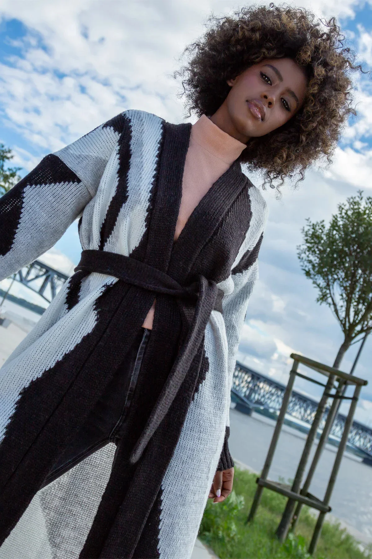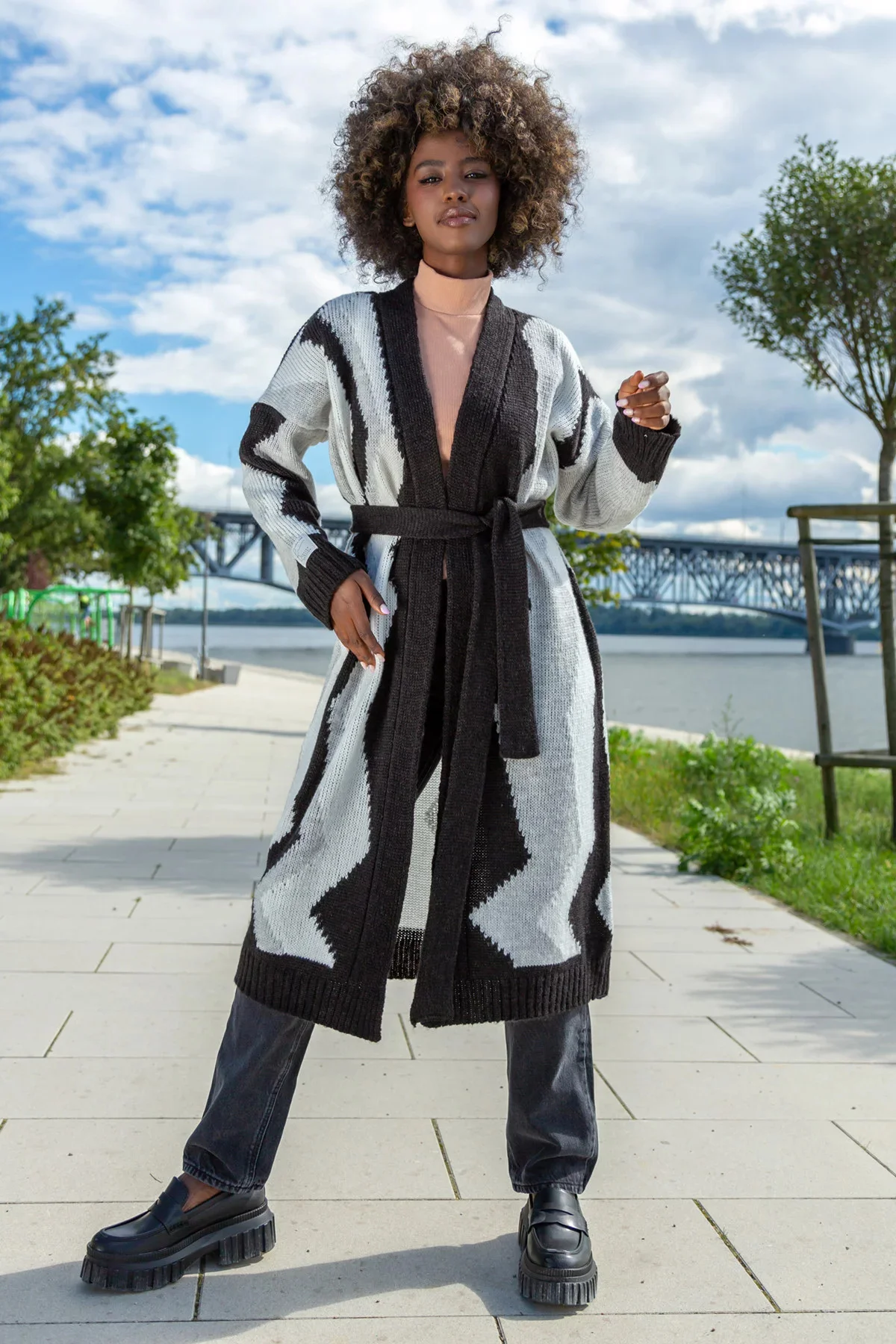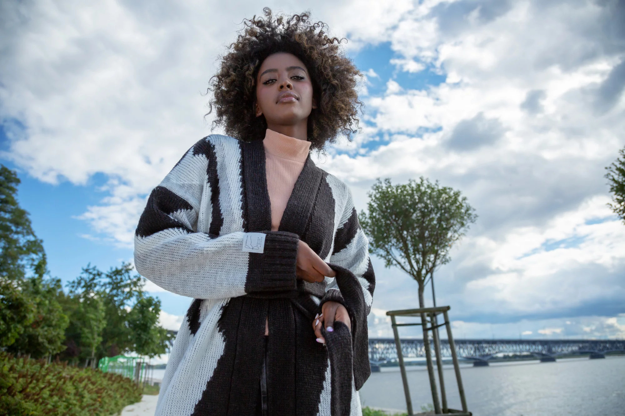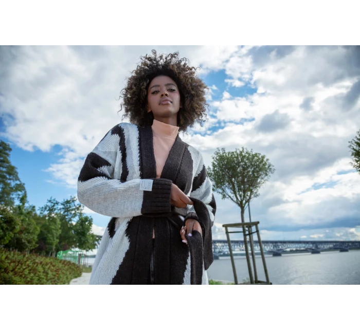Dlouhý svetr bez zapínání, jehož charakteristickým prvkem je barevný klikatý vzor. Lehké, pohodlné, ideální pro první chladné počasí. V teplejších podzimních dnech ji můžete nosit jako svrchní oděv. Kardigan s páskem, můžete s ním zdůraznit pas. Můžete si dovolit trochu šílenství v oblékání v kanceláři? Výběrem karamelového nebo šedého kardiganu a jeho kombinací s klasickou halenkou a pomačkanými kalhotami získáte méně oficiální verzi kancelářského outfitu. Odvážnějším doporučujeme barevné verze tohoto svetru.