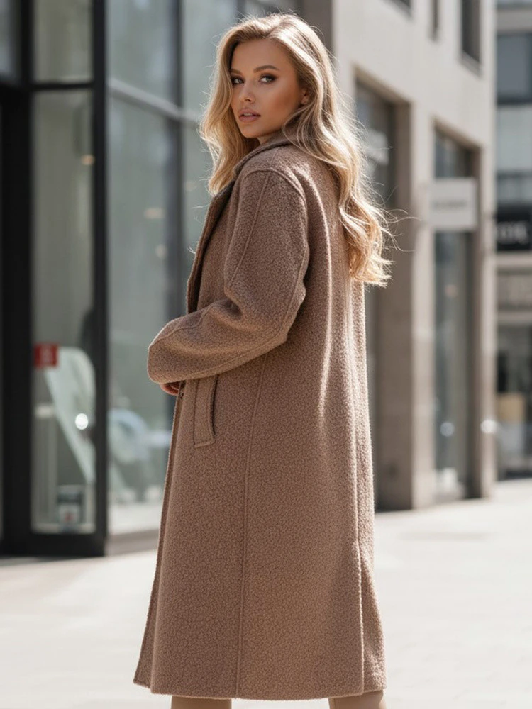Damski płaszcz baranek w odcieniu beżowym to propozycja dla kobiet ceniących wygodę i nowoczesny styl. Miękka faktura materiału i lekko oversize’owy krój sprawiają, że model doskonale otula sylwetkę i nadaje całości swobodnego charakteru. Klasyczny kołnierz z szerokimi klapami dodaje elegancji, a praktyczne kieszenie podkreślają funkcjonalność płaszcza.