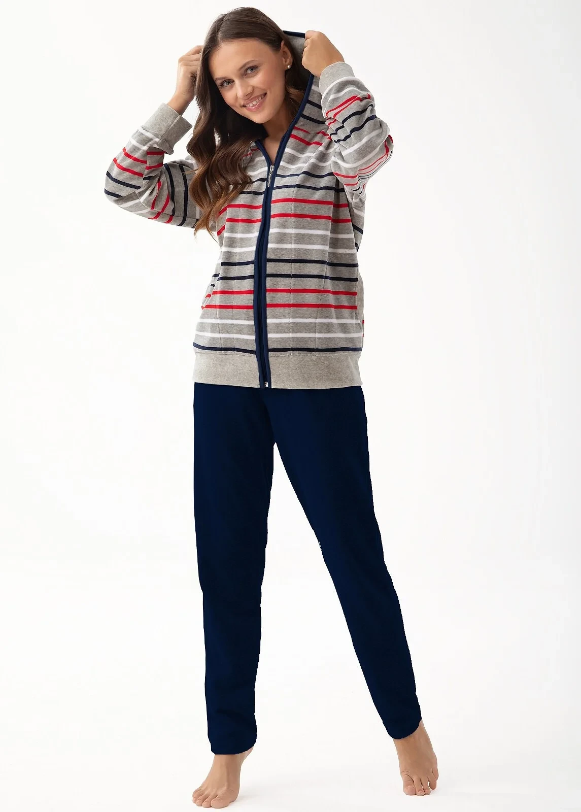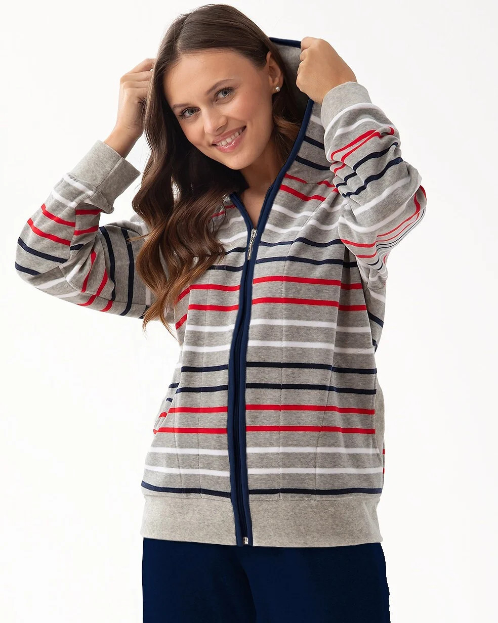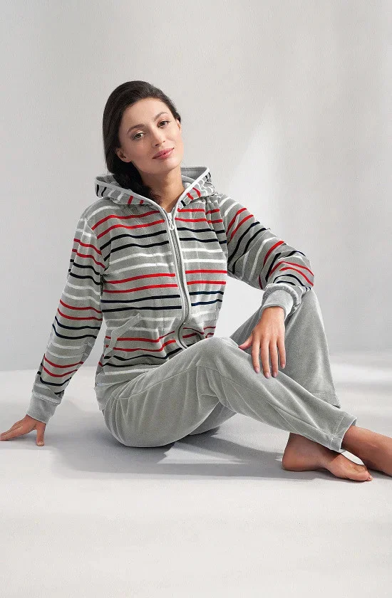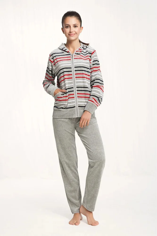Dres je vhodný pro cvičení, jako domácí oblečení, pro sportovní výlety, na kolo, nebo na procházku. Blůza soupravy má kapuci, pohodlné kapsy a zapíná se zipem. Jednoduché kalhoty mají volný střih. Rukávy a nohavice jsou olemované stahovacími lemy.