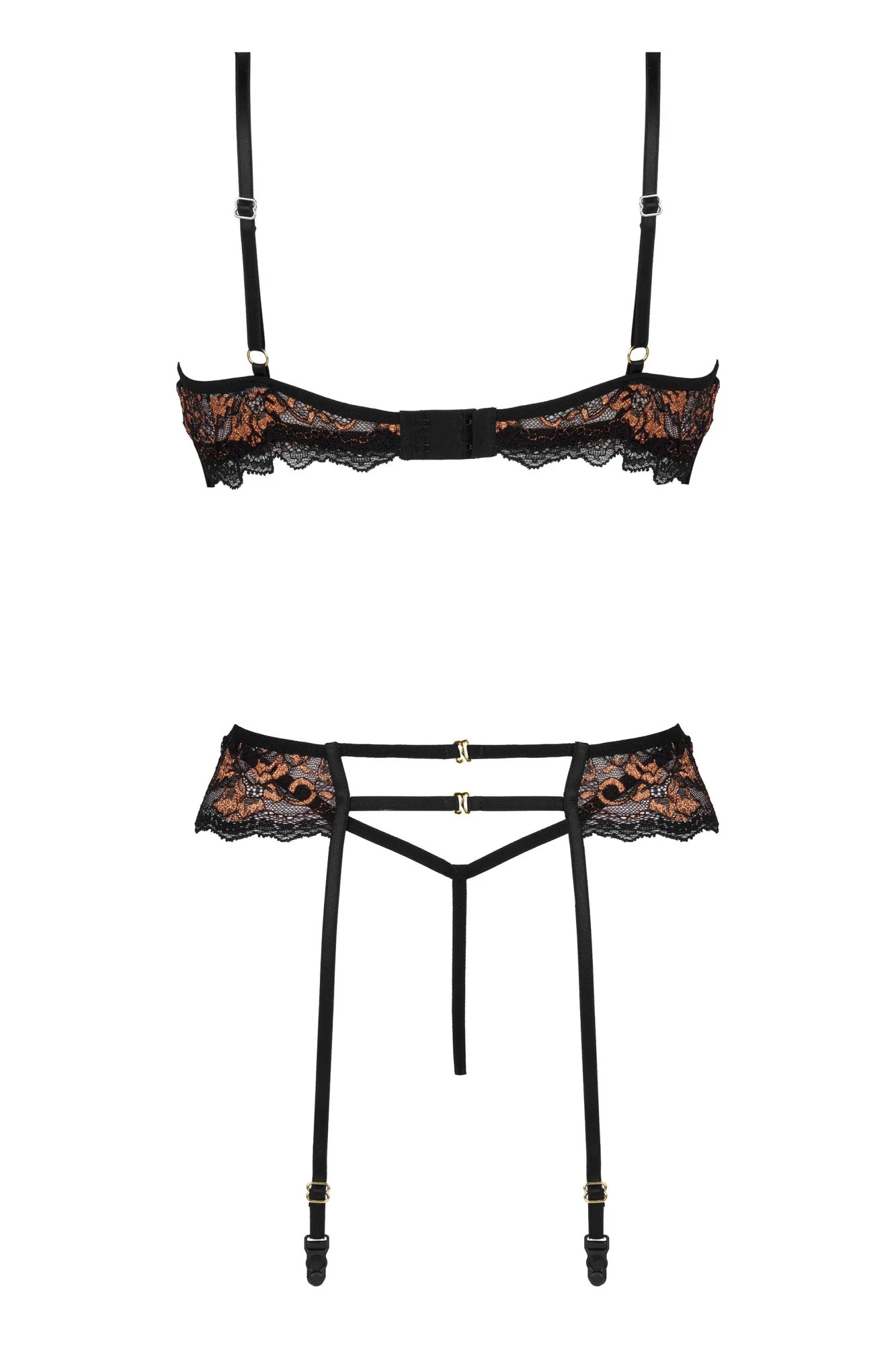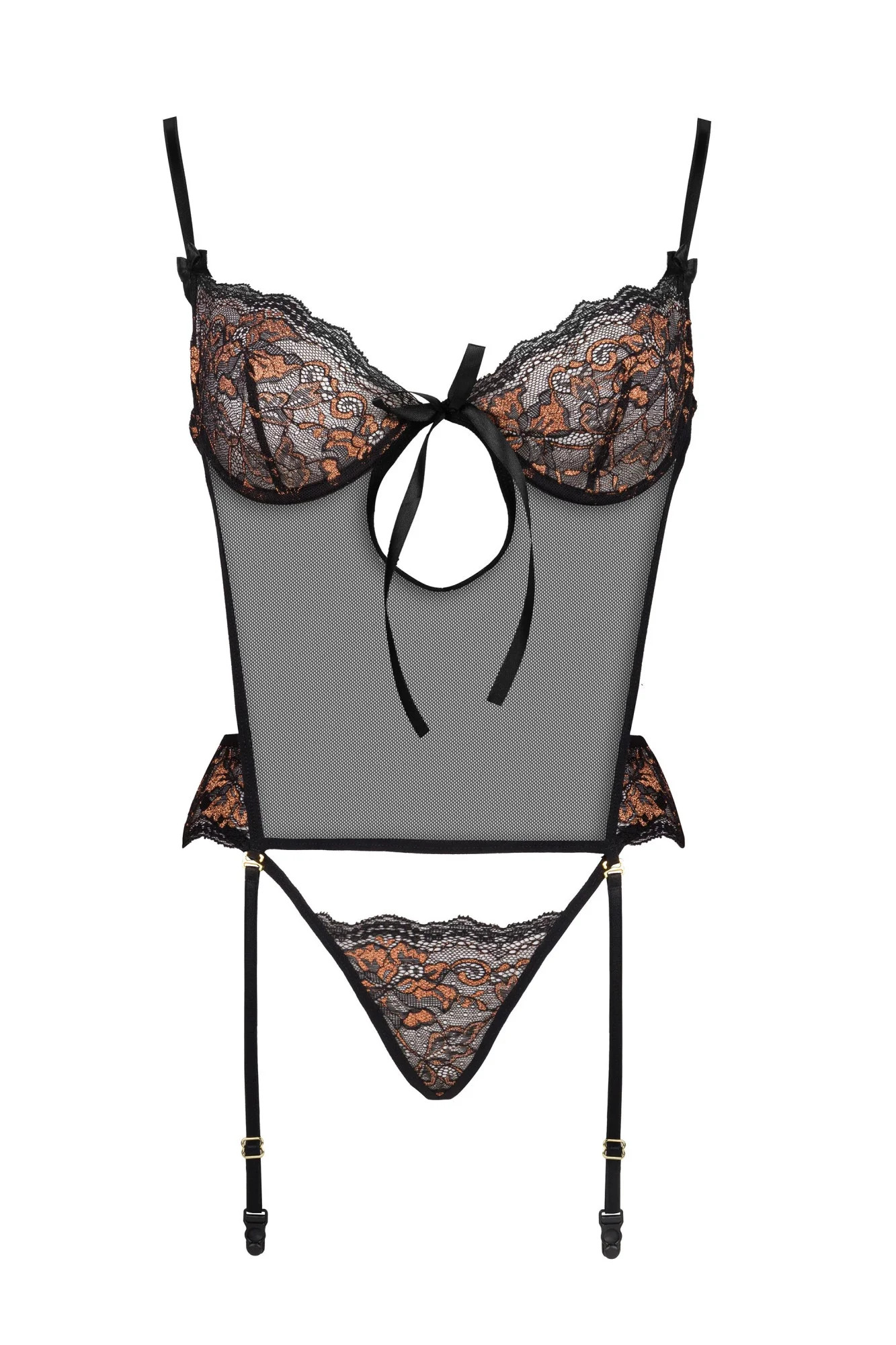 Dámský erotický korzet Goldie corset BEAUTY NIGHT FASHION - černá barva - z průsvitné síťoviny a krajky - krajkové košíčky s kosticí odhalují dekolt - zapínání na háčky - nastavitelná ramínka - podvazkové pásky - krajková tanga