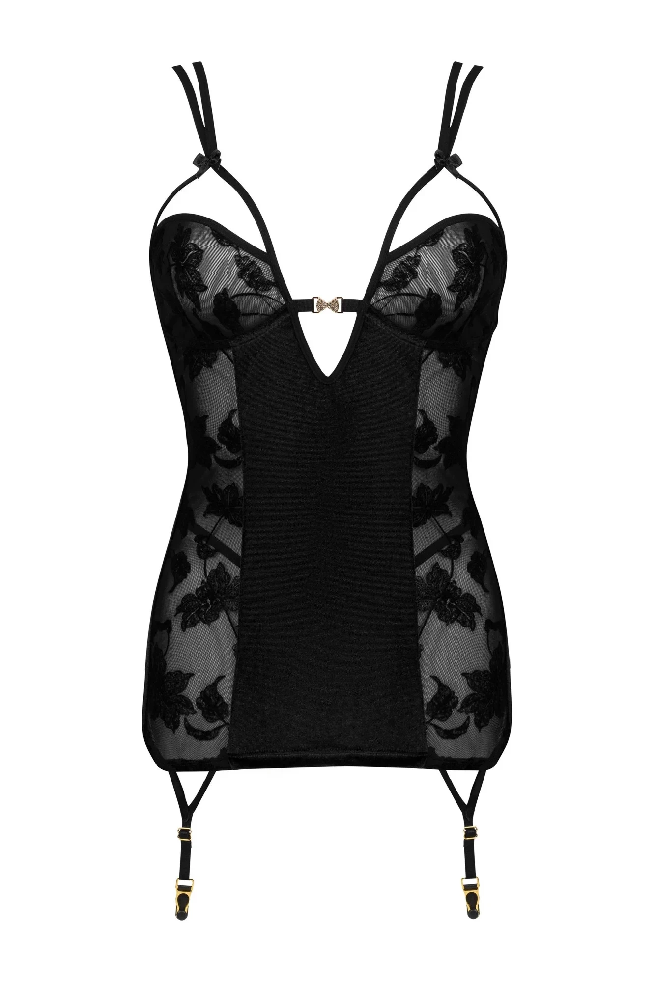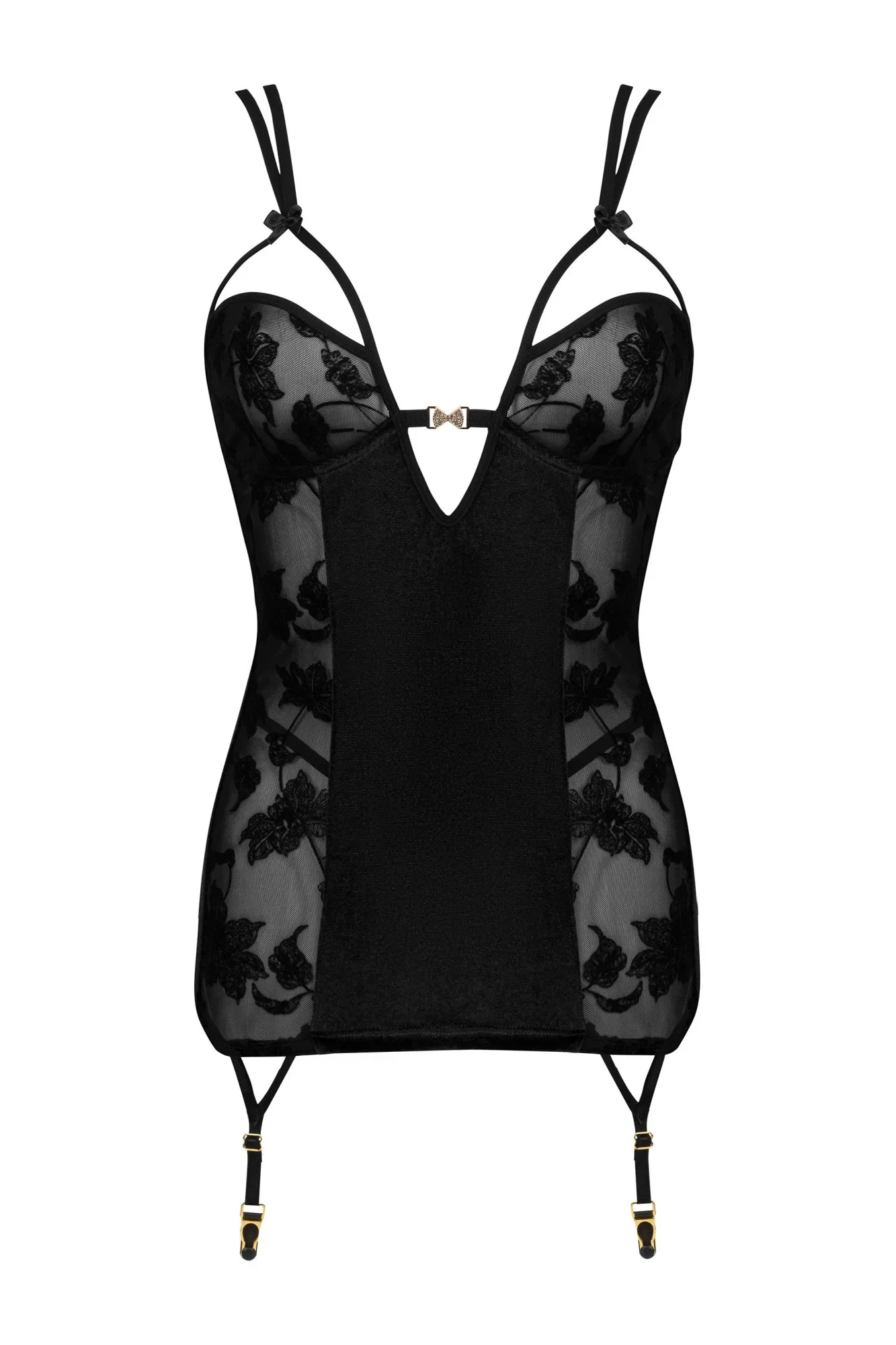 Dámský erotický korzet Xiomara BEAUTY NIGHT FASHION - černá barva - z jemné krajky a sametu - košíčky s kosticí krásně odhalují poprsí - ramínka nastavitelná - zadní část zdobí efektní šněrování - podvazkové pásy doplňují smyslný vzhled šatů - součástí korzetu jsou sametová tanga