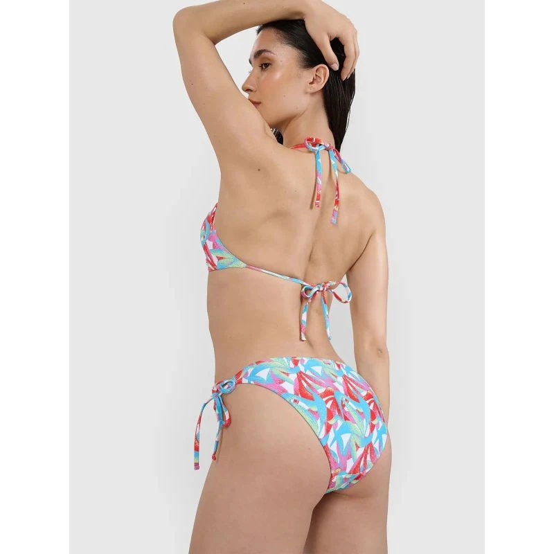 Model halter bikini ma trójkątne, lekko usztywniane miseczki, które delikatnie modelują biust. Wiązanie na szyi i plecach umożliwia indywidualne dopasowanie do ciała, a wyjmowane wkładki pozwalają dostosować poziom wsparcia i kształt miseczek.