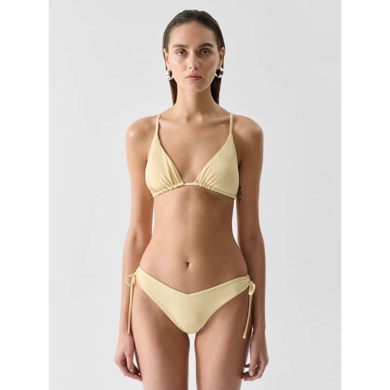 Horní díl bikinje vyrobenzměkké a pružnésyntetické tkaniny a spojujeeleganci a pohodlí. trojúhelníkové košíčky s vyjímatelnýmivložkami umožňujípřizpůsobení střihu a poskytují ideální oporu. jemná, propletená ramínka, která se na zádech kříží a zapínají na půvabnézavazování, dodávají jemnost a ženskost.
