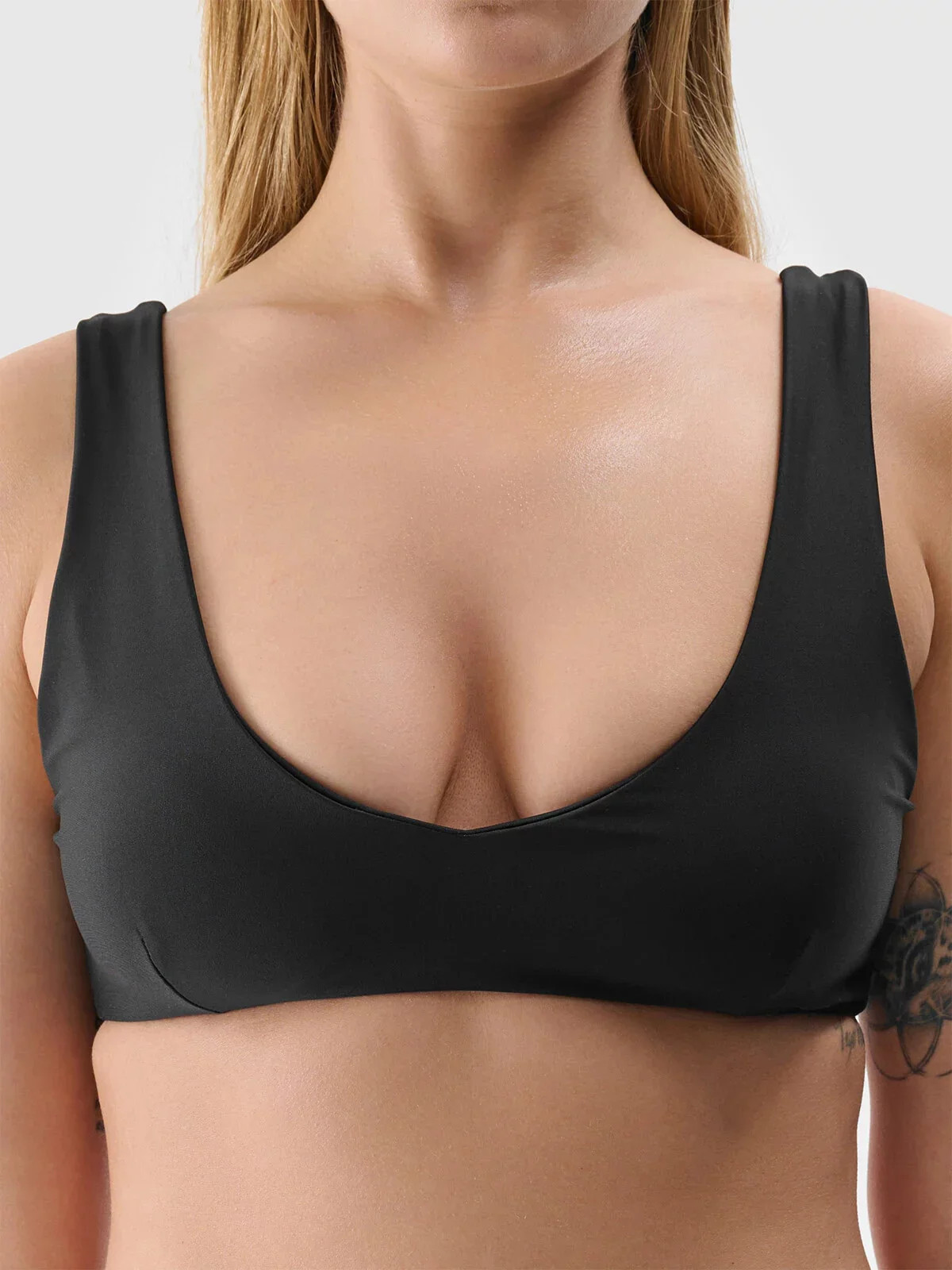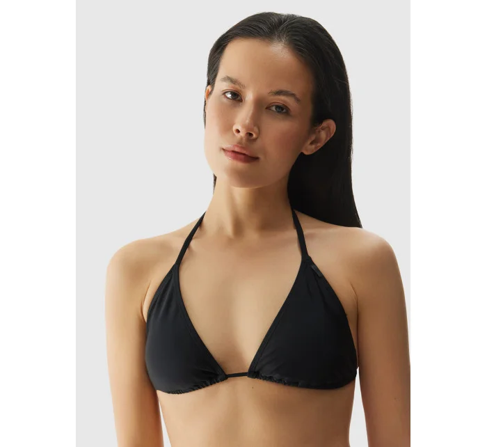 Střih halter s mírně vyztuženými trojúhelníkovými košíčky a páskou pod prsy.