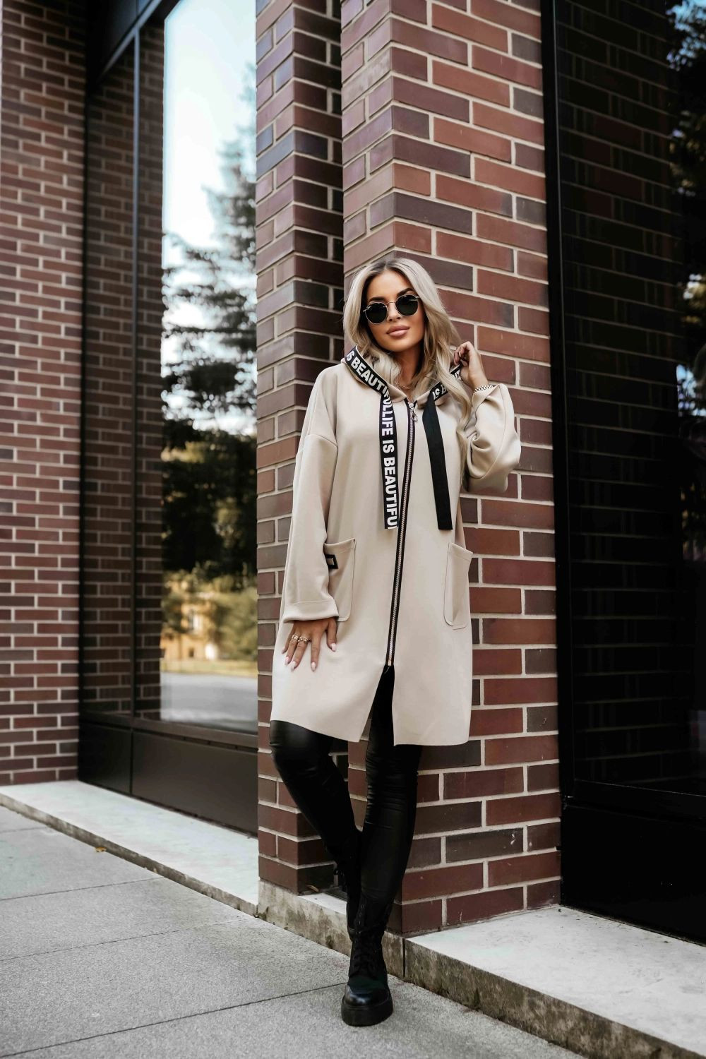 Dámský kabát 632-1 Numoco basic - béžová barva - z měkkého a příjemného materiálu - pohodlný střih - praktické kapsy - šňůrky s potiskem - s kapucí