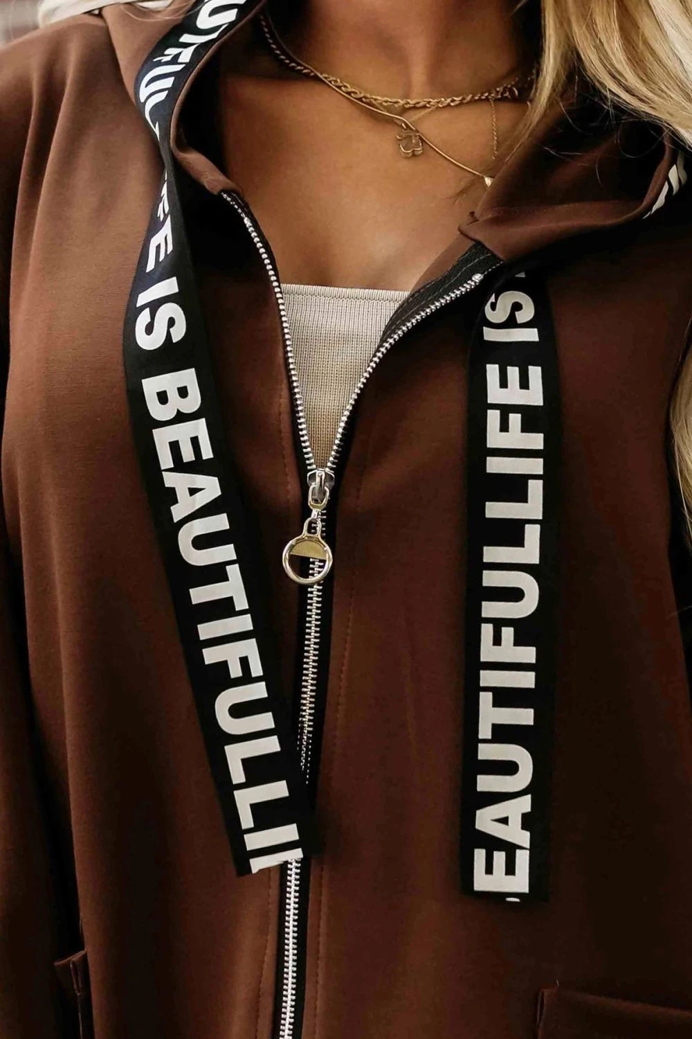 Dámský kabát 632-2 Numoco basic - hnědá barva - z měkkého a příjemného materiálu - pohodlný střih - praktické kapsy - šňůrky s potiskem - s kapucí