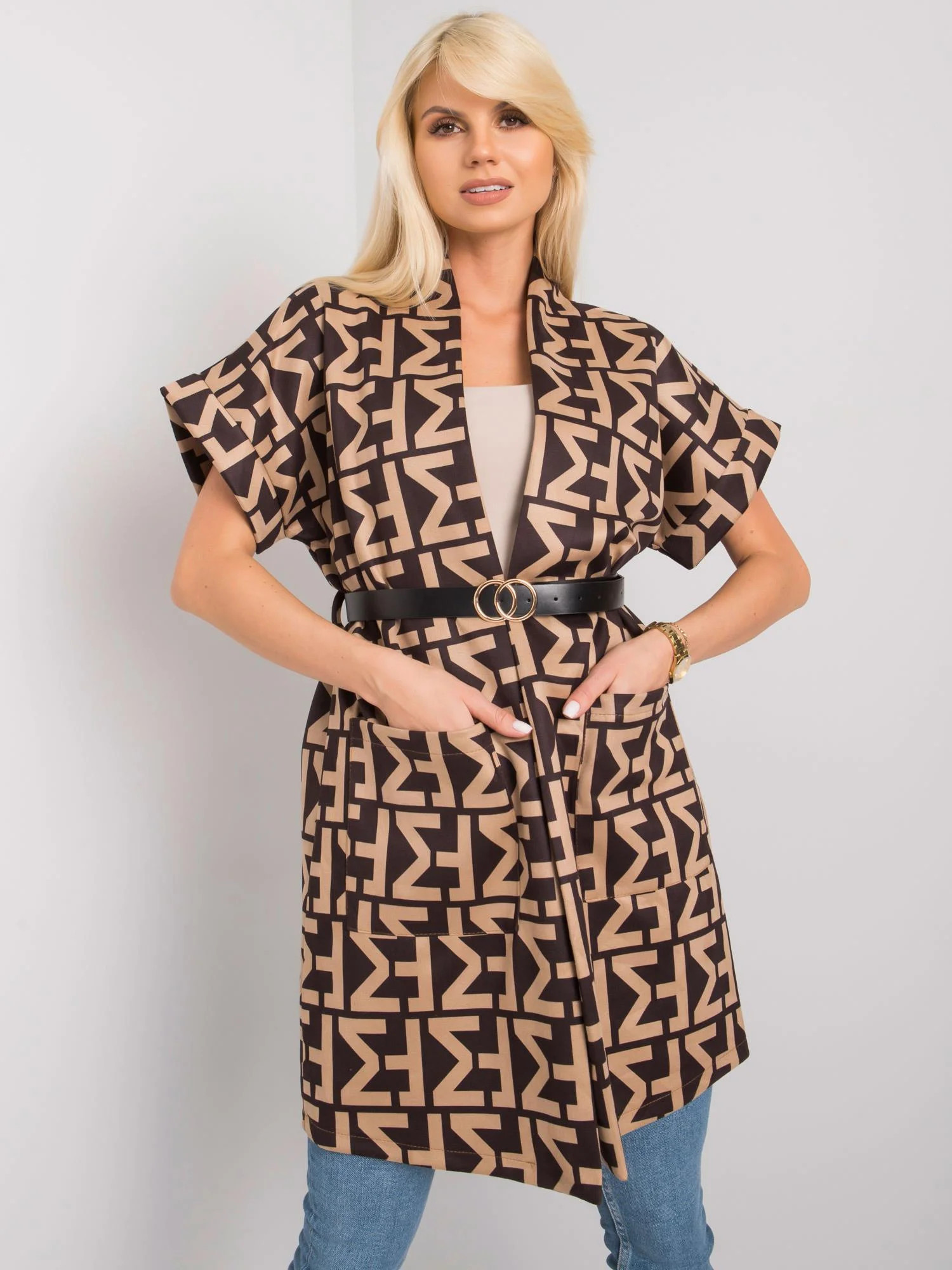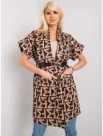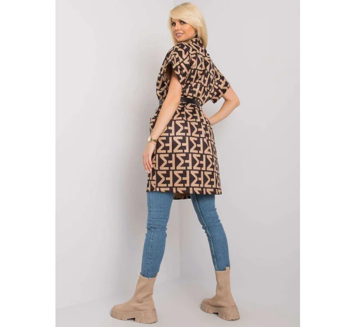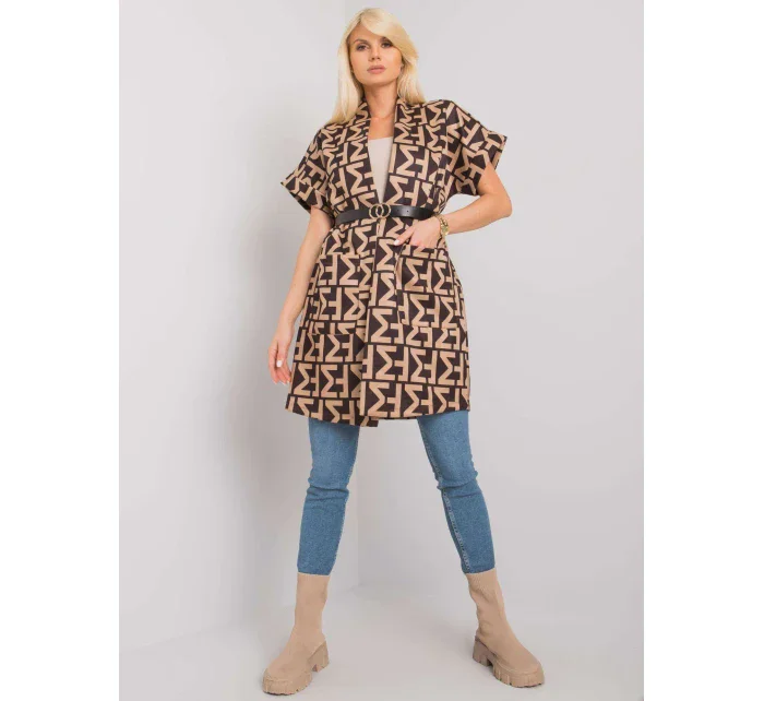 Béžový a černý kabát s krátkým rukávem.
