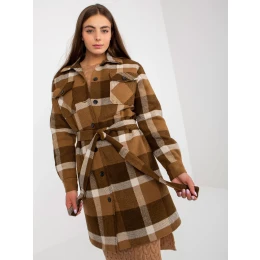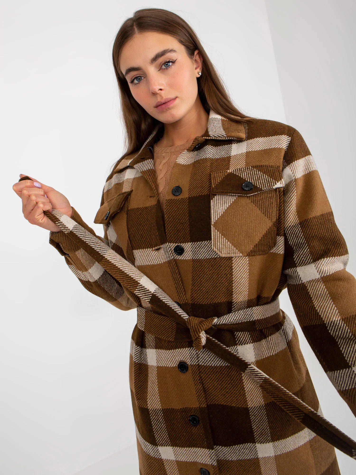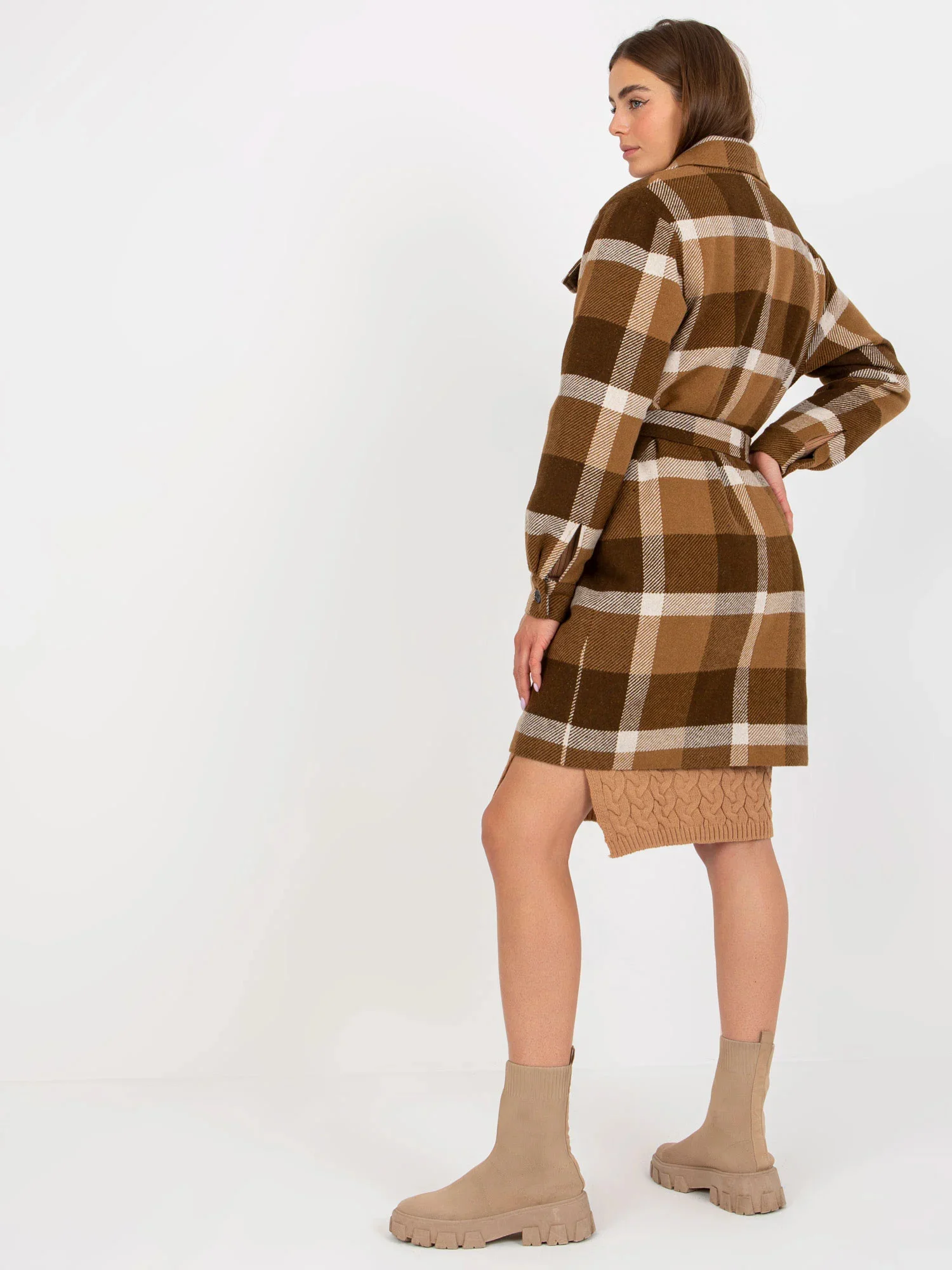 Hnědý dámský kostkovaný kabát se zapínáním na knoflíky .