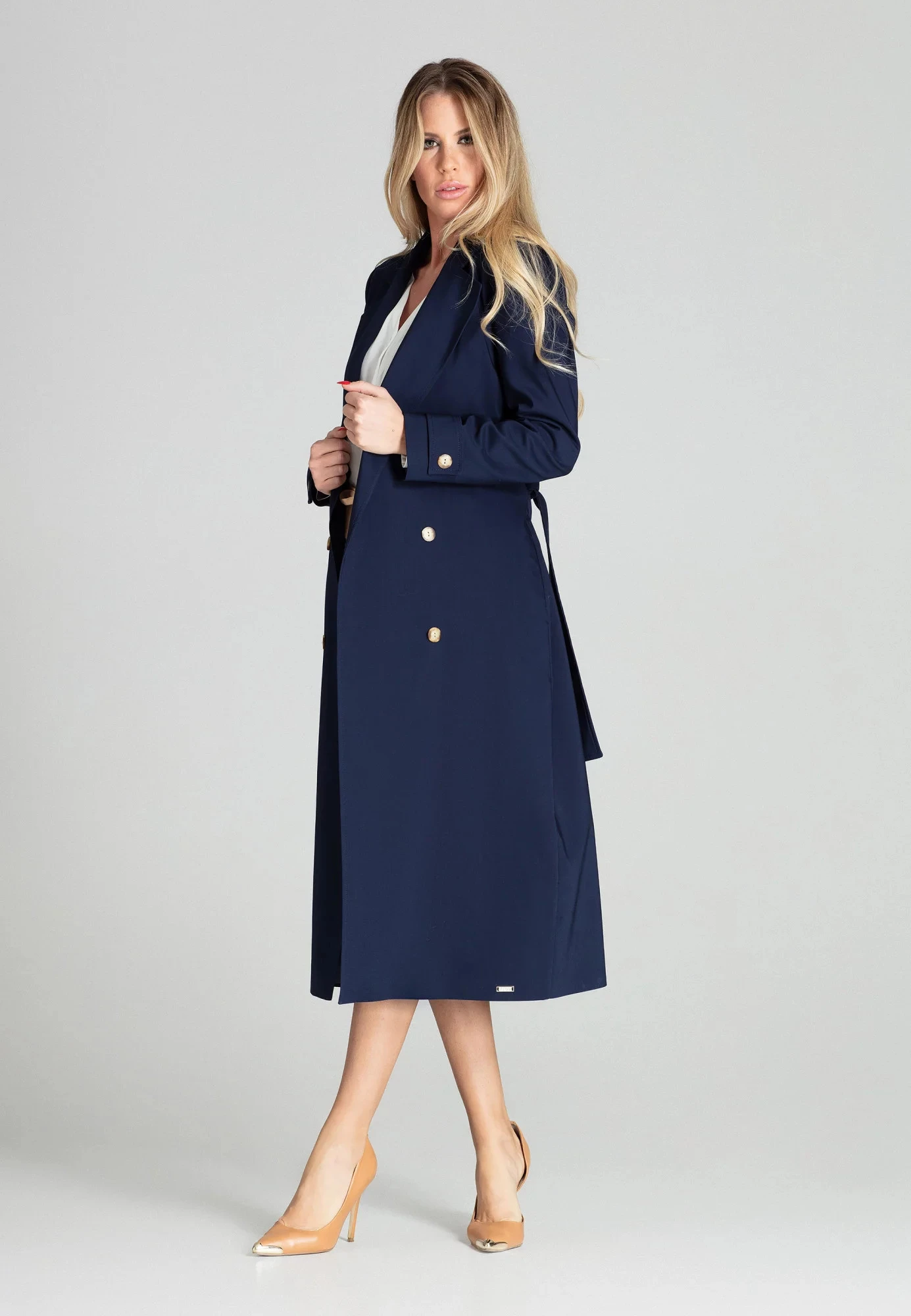 Námořnický dlouhý klasický jarní kabát s podšívkou. Dvouřadé zapínání, kapsy na bocích, zavazování v pase.