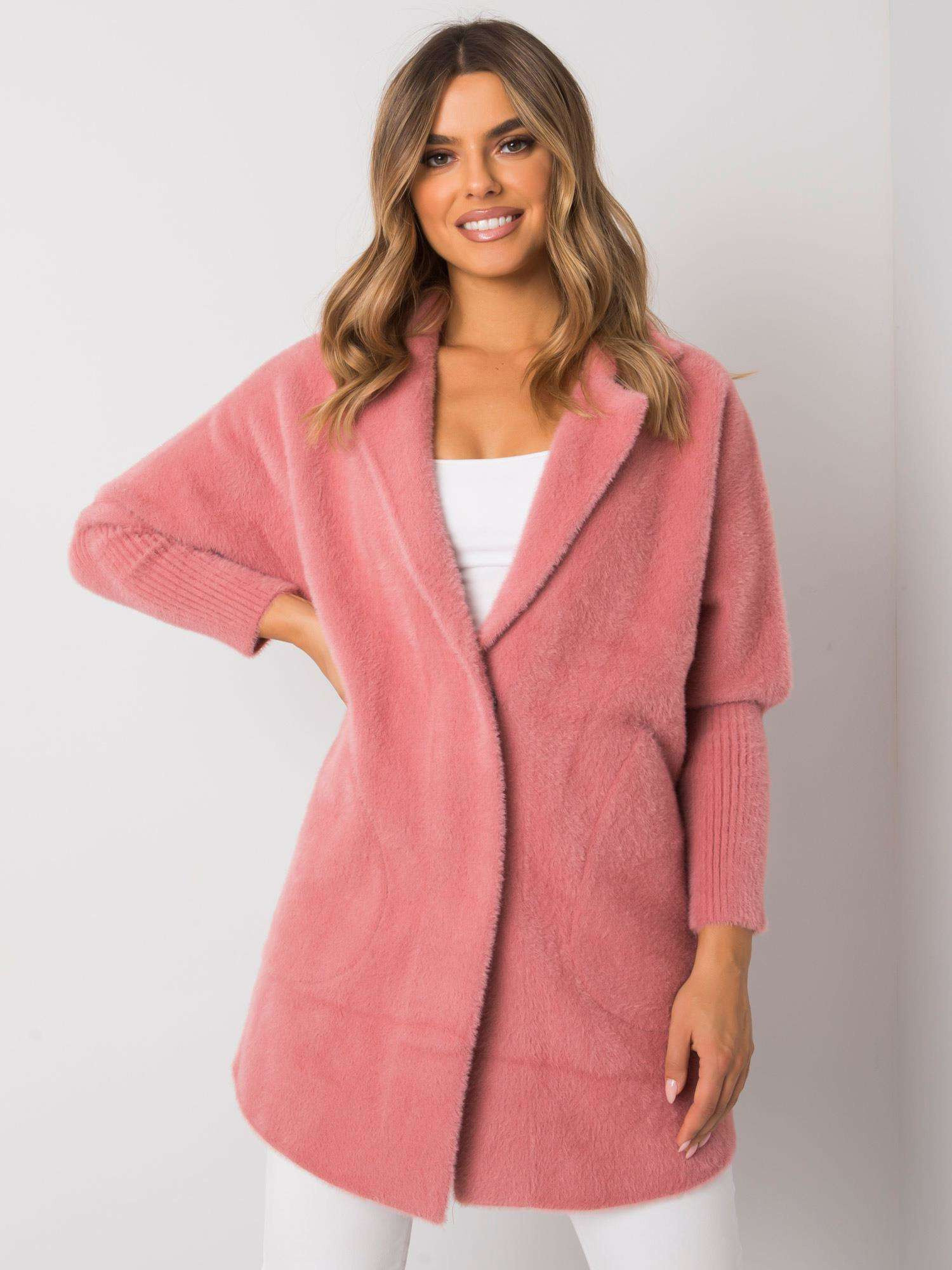 Růžový huňatý kabát z alpaky.