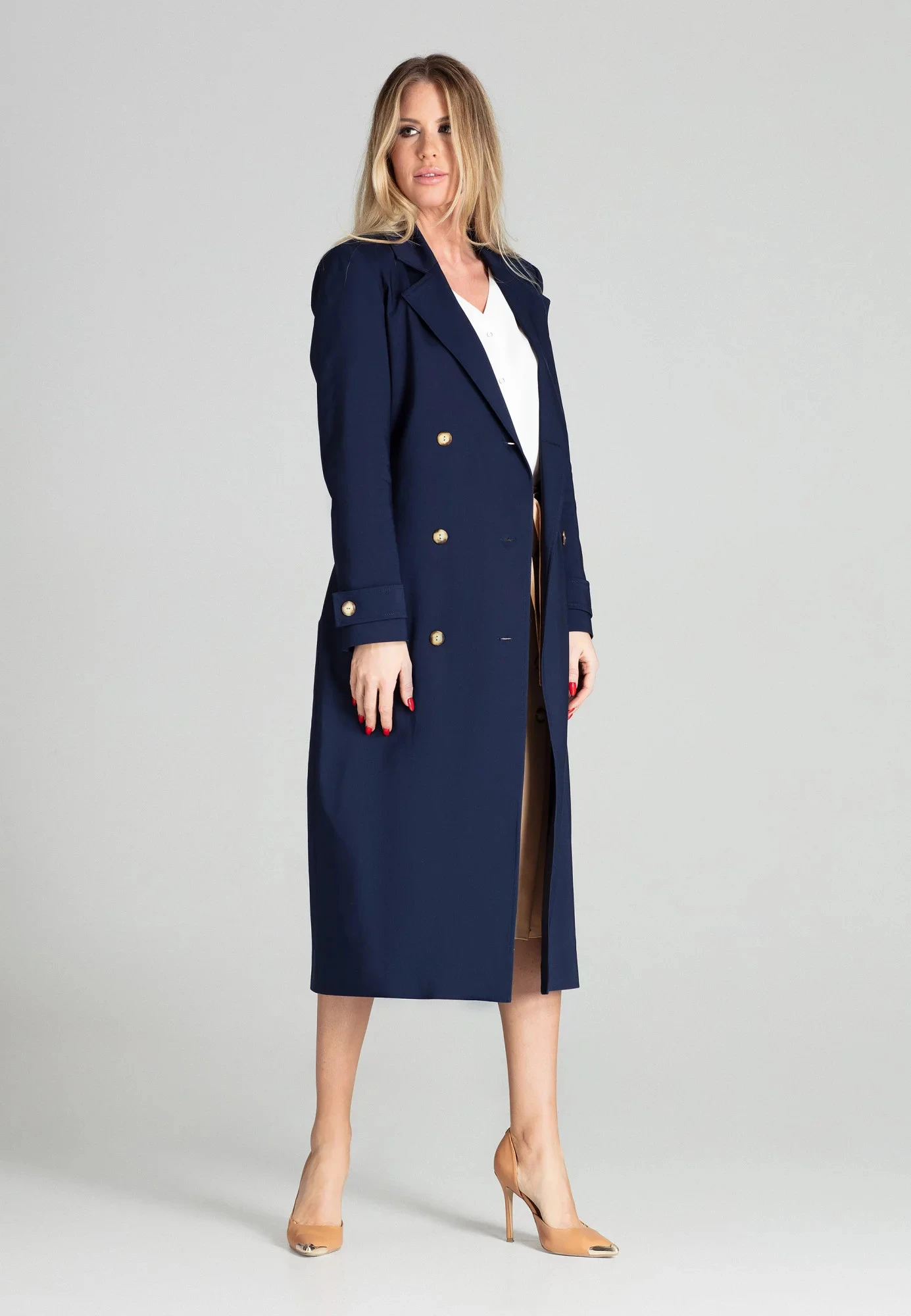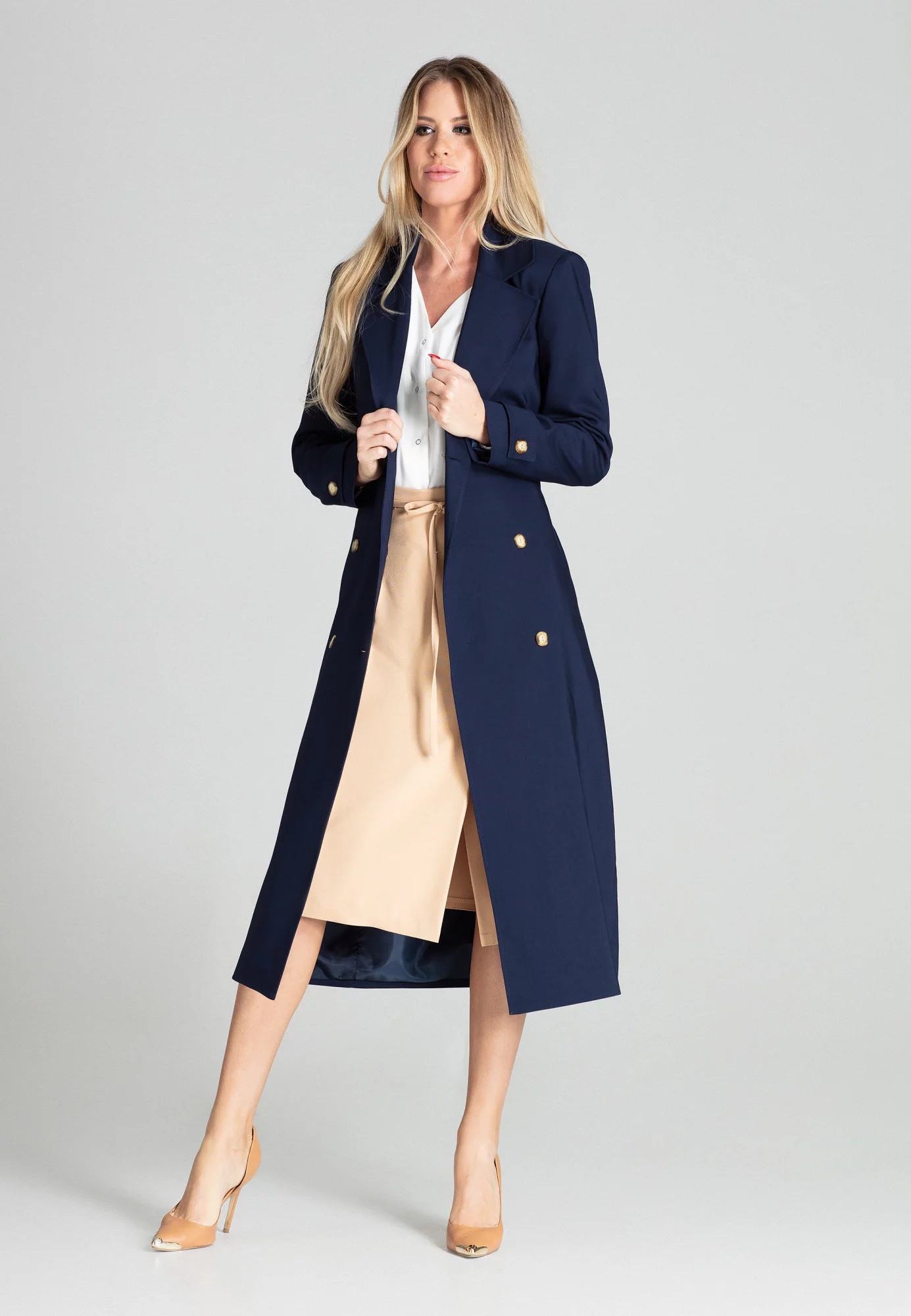 Námořnický dlouhý klasický jarní kabát s podšívkou. Dvouřadé zapínání, kapsy na bocích, zavazování v pase.