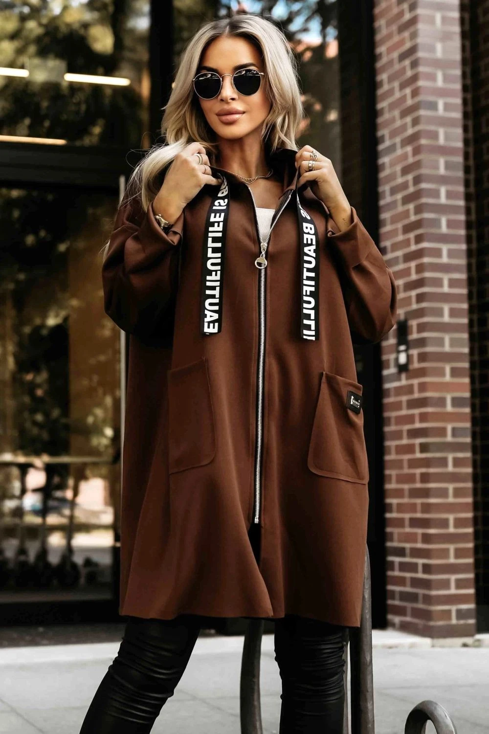 Dámský kabát 632-2 Numoco basic - hnědá barva - z měkkého a příjemného materiálu - pohodlný střih - praktické kapsy - šňůrky s potiskem - s kapucí