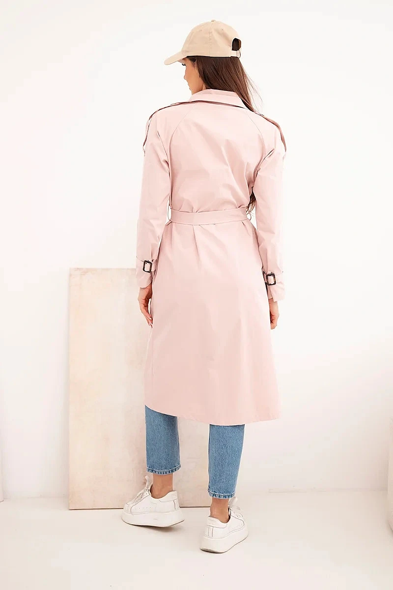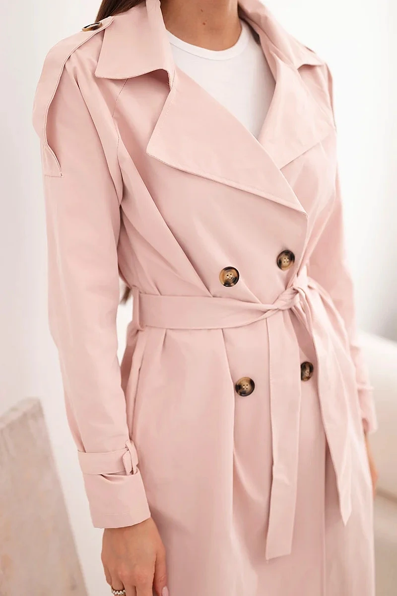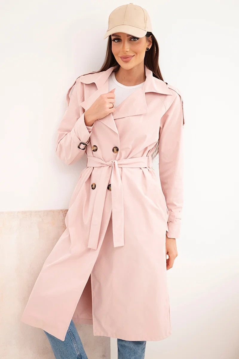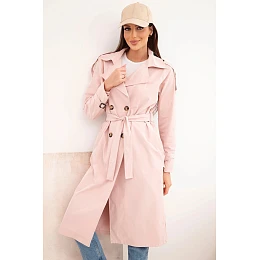 Stylový dámský kabát klasického střihu je nezbytným prvkem každého dámského šatníku. Model s efektním, širokým límcem, vázaným páskem v pase a dvojitým řadou knoflíků odkazuje na nadčasový styl trenčkotů. Délka nad kolena a zúžení v pase krásně podtrhují siluetu, přidávající celku eleganci. Rukávy s ozdobným manžetou a jemným nařasením na ramenou dodávají lehkost a ženský charakter.