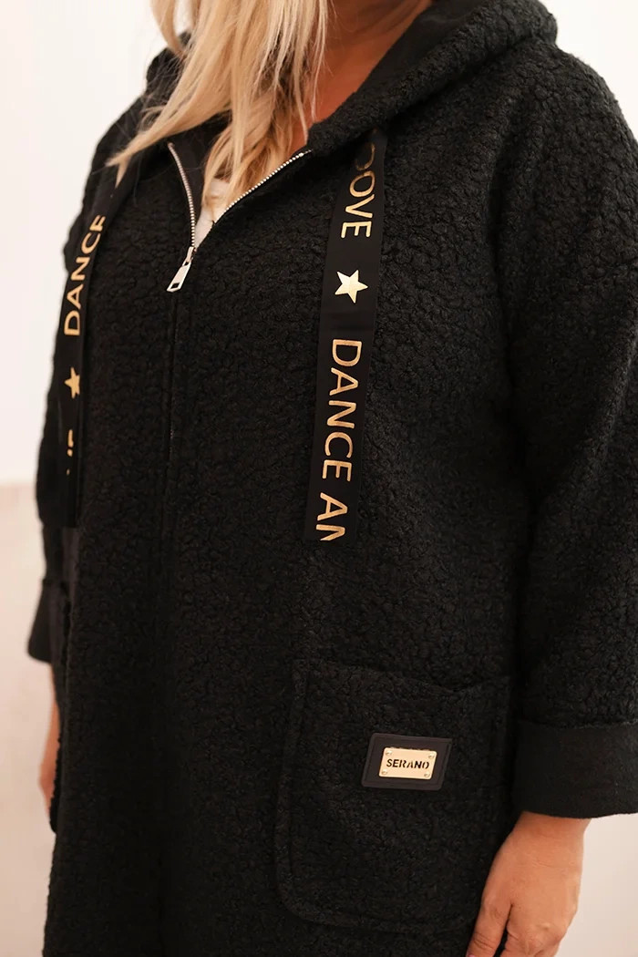 Pohodlná dámská mikina Plus Size v oversize střihu je ideální volbou na chladnější dny. Vyrobena z měkkého, teplého materiálu s texturou „beránek“, zajišťuje komfort nošení a módní, uvolněný vzhled. Mikina má praktickou kapuci se zdobnými šňůrkami, velké kapsy vpředu a zip, který usnadňuje oblékání.