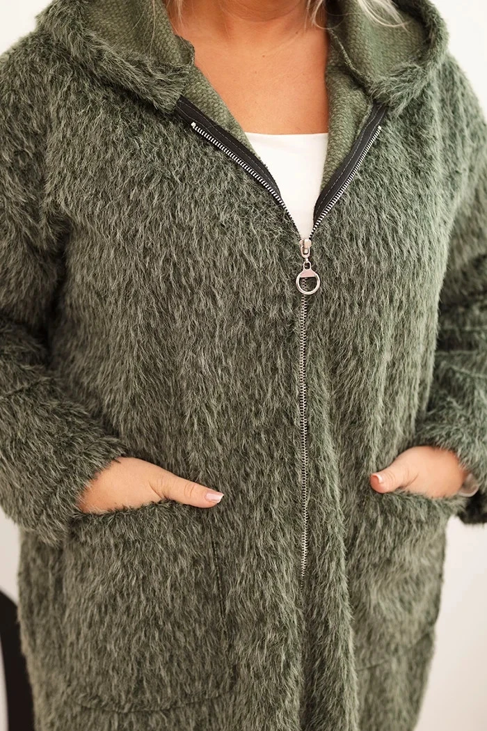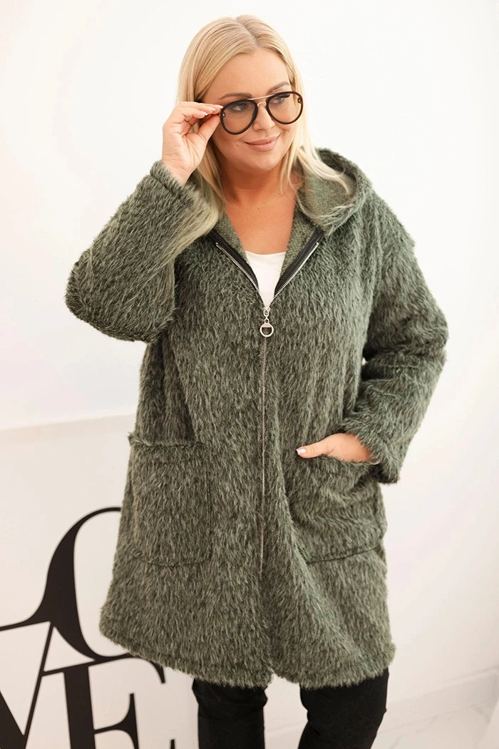 Dámský kabát Plus Size z viskózy na zip s kapucí khaki