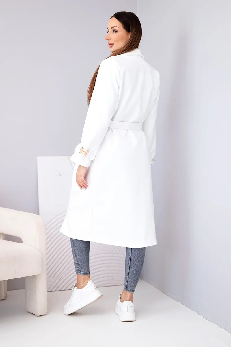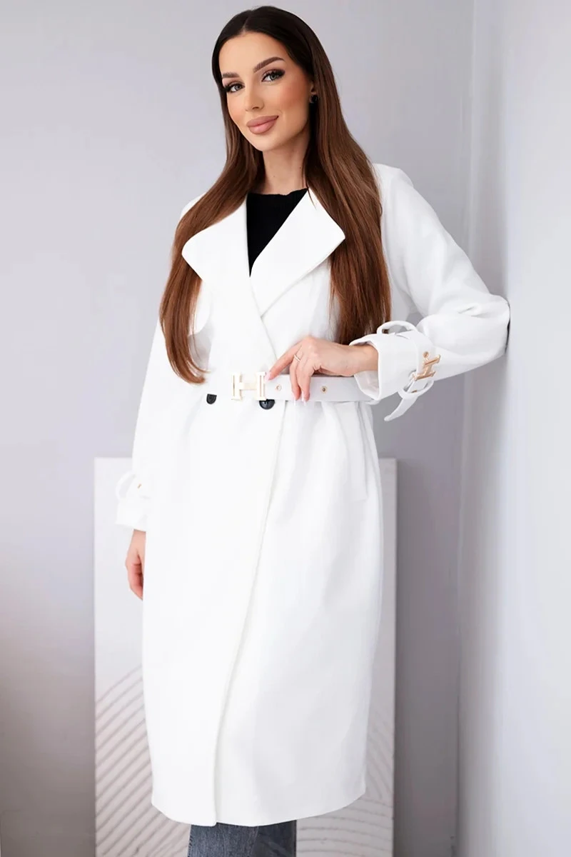 Dámský kabát s páskem a zlatými přezkami ecru