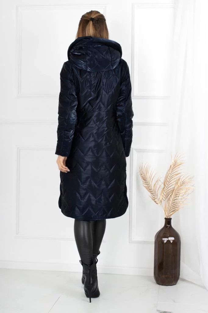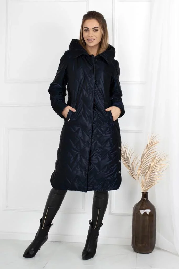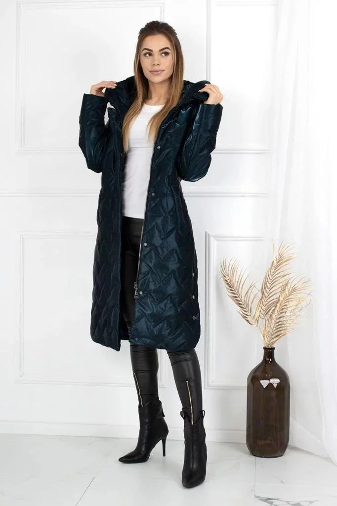 Prošívaný kabát s vysokým límcem a kapucí. Zapíná se na krytý zip a patentky.