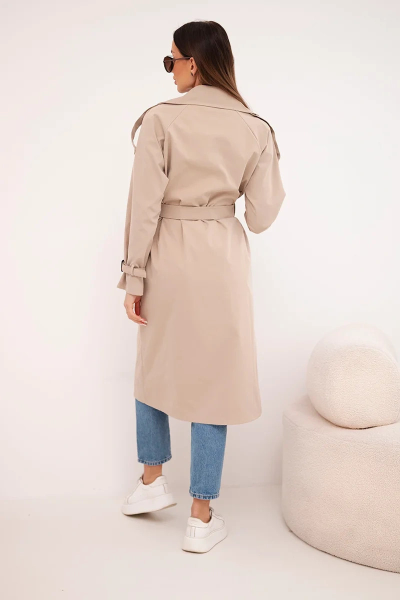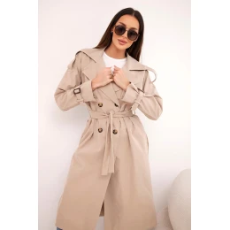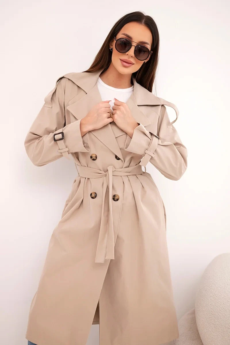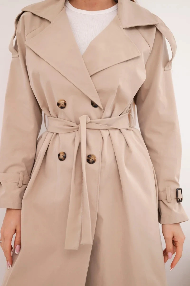 Stylový dámský kabát klasického střihu je nezbytným prvkem každého dámského šatníku. Model s efektním, širokým límcem, vázaným páskem v pase a dvojitým řadou knoflíků odkazuje na nadčasový styl trenčkotů. Délka nad kolena a zúžení v pase krásně podtrhují siluetu, přidávající celku eleganci. Rukávy s ozdobným manžetou a jemným nařasením na ramenou dodávají lehkost a ženský charakter.